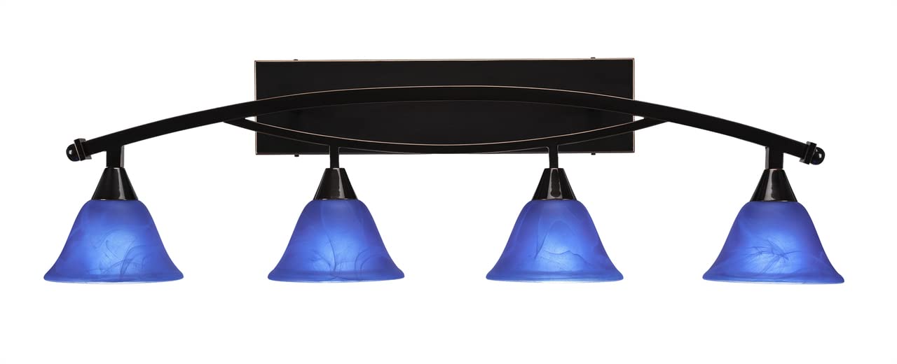 174-BC-4155 Bow 4 Light Bath Bar Shown In Black Copper Finish with 7" Blue Italian Glass. Rated for: Dry location. Light Bulb Data: 4 Medium 100 watt. Bulb included: No.