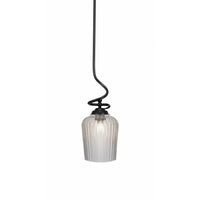 Q: What is the finish of the Toltec Lighting Capri Pendant?A: The Toltec Lighting Capri 1 Light Pendant features a stylish matte black finish, complemented by a clear textured glass shade for a modern look.