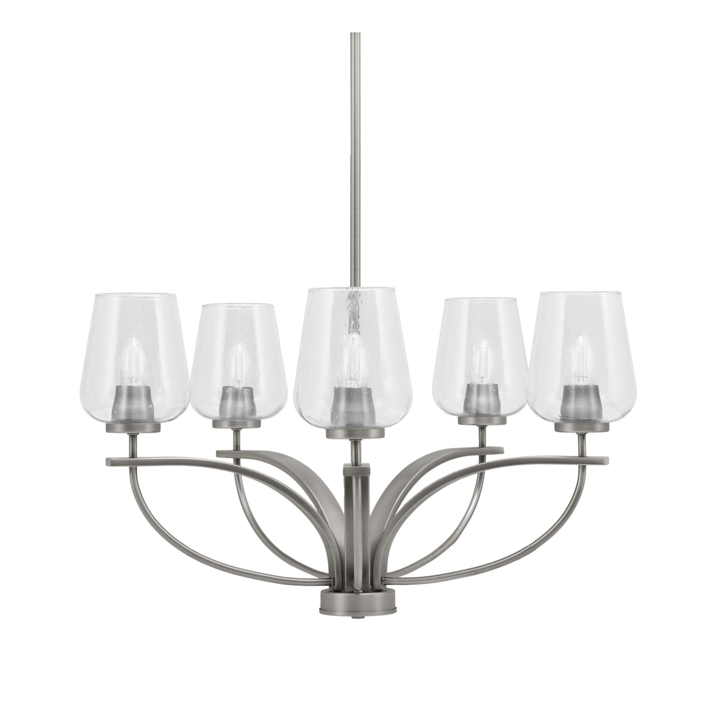 Q: What is the design style of the Toltec Lighting Cavella chandelier?A: The Toltec Lighting Cavella chandelier features a modern design with a graphite finish and 5-inch clear bubble glass, making it a stylish addition to contemporary and industrial decor.