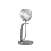 Q: What is the size of the Toltec Lighting Cavella Accent Lamp?A: The Toltec Lighting Cavella Accent Lamp features a size of 5.75 inches, showcasing a beautiful Onyx Swirl glass.