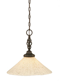 The Toltech Lighting 82-DG-714 Eleganté One-Light Pendant Dark Granite Finish with Gold Ice Glass, 16-Inch is a ceiling light that features a 16-Inch gold ice glass shade. This chain hung fixture comes with 10-Feet of chain and 11-Feet of wire. Product dimensions (in Inch): 15 H by 16 W. Fixture requires 1 150-Watt medium base incandescent bulb, not included. Product safety tested and approved by the UL/CUL in the US and Canada. Assembly required.
