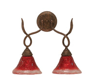 The Toltech Lighting 110-BRZ-756 Leaf Two-Light Wall Sconce Bronze Finish with Raspberry Crystal Glass Shade, 7-Inch is a wall light that features a 7-Inch raspberry crystal glass shade. back plate dimensions: w 1-Inch by l 5-Inch by h 5-Inch. Product dimensions (in Inch): 14.5 H by 7.5 W. Fixture requires 2 100-Watt medium base incandescent bulbs, not included. Product safety tested and approved by the UL/CUL in the US and Canada. Assembly required.