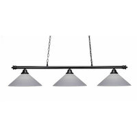 Q: What materials are used in the construction of the Toltec Lighting Oxford?A: The Toltec Lighting Oxford 3 Light Island is constructed from steel with a matte black finish and features gray matrix glass shades, providing a modern and stylish look.