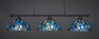 Q: What makes the Toltec Lighting Oxford 3 Light Island a good choice for a billiard or pool table?A: Its long 56.25-inch design provides ample lighting over billiard or pool tables, while the stylish matte black finish and blue mosaic glass add a decorative touch to your game room.