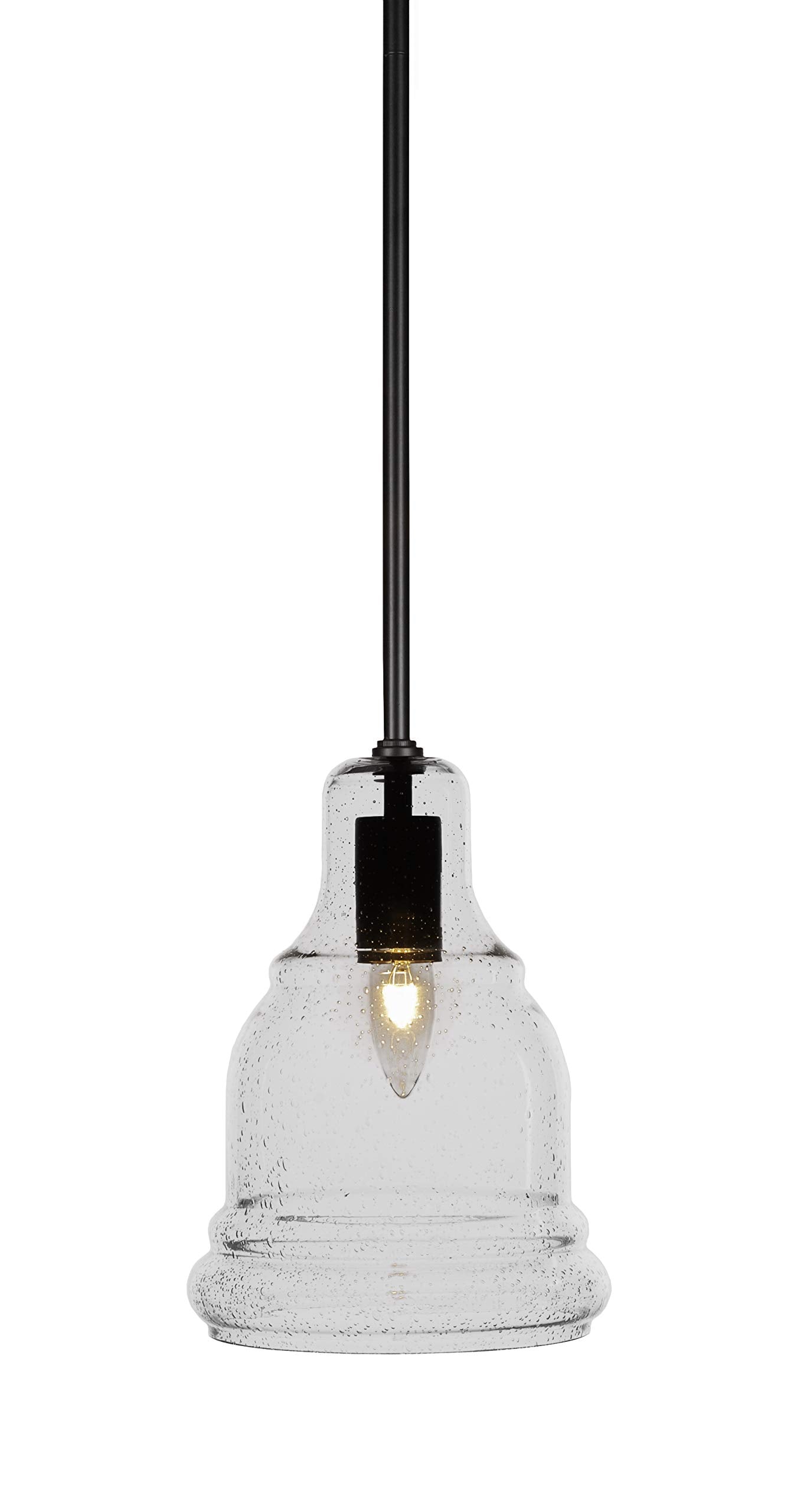 Q: What materials are used in the construction of the Toltec Lighting Palisade Pendant?A: The pendant light features a durable steel construction with a striking matte black finish and a clear bubble glass shade that adds a touch of elegance.