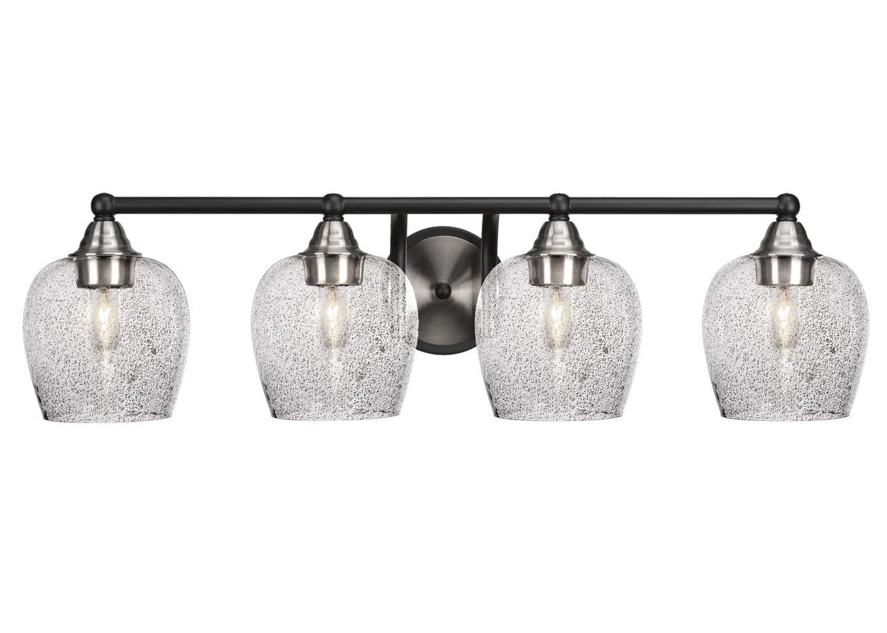 Q: What is the finish of the Toltec Lighting Paramount 4 Light Bath Bar?A: The Toltec Lighting Paramount 4 Light Bath Bar features a stylish combination of Matte Black and Brushed Nickel finishes, providing a modern aesthetic to your bathroom decor.