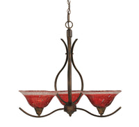 The Toltech Lighting 293-BRZ-736 Swoop Three-Light Up light Chandelier Bronze Finish with Raspberry Crystal Glass Shade, 10-Inch is a ceiling light that features a 10-Inch raspberry crystal glass shade. This chain hung fixture comes with 10-Feet of chain and 11-Feet of wire. Product dimensions (in Inch): 25 H by 23.25 W. Fixture requires 3 100-Watt medium base incandescent bulbs, not included. Product safety tested and approved by the UL/CUL in the US and Canada. Assembly required.