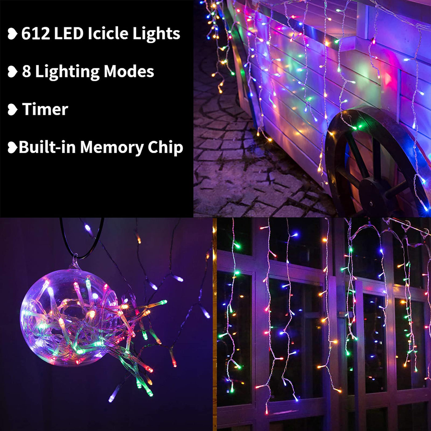 Toodour Icicle Christmas Lights, 612 Led 50.4Ft 8 Modes Icicle String Lights With 102 Drops, Window Curtain Fairy Icicle Lights,