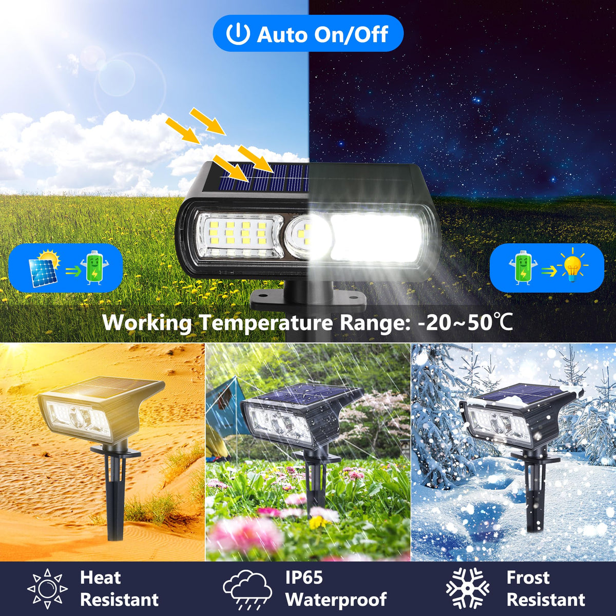 Q: What are the brightness modes available for these solar lights?A: These solar spot lights offer two brightness modes: a low light mode that can last for 18-20 hours and a high light mode that lasts for 8-10 hours when fully charged. This flexibility allows you to choose the perfect ambiance for your outdoor space.