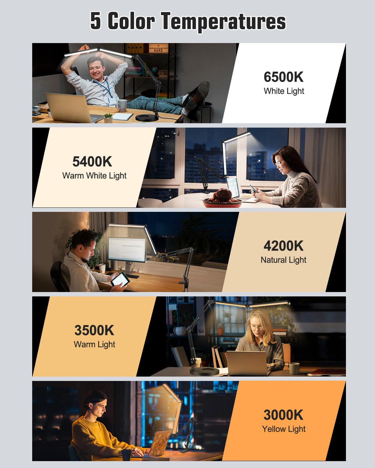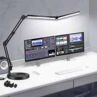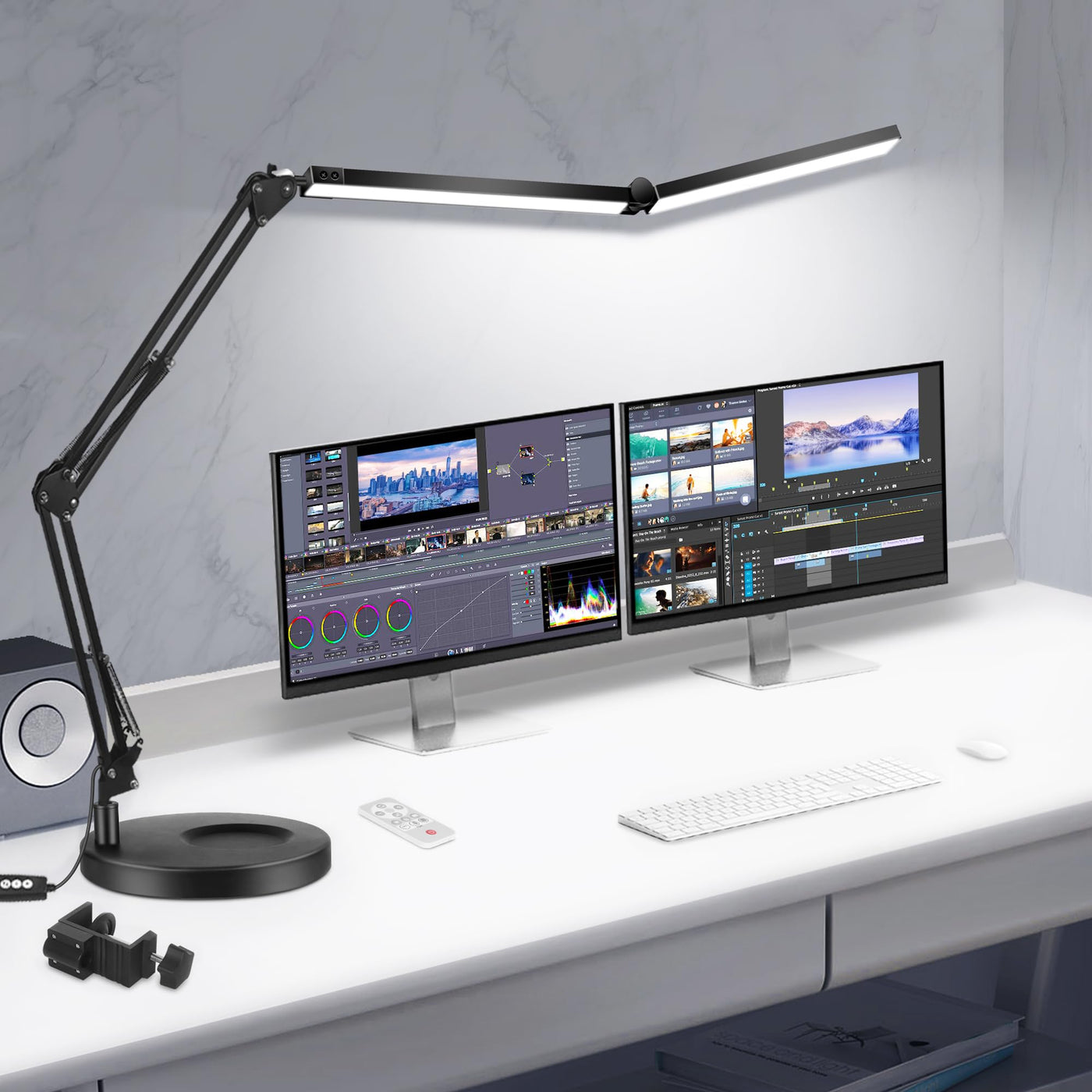 Q: Is the Toolour Desk Lamp suitable for large workspaces?A: Yes, the Toolour Desk Lamp features an ultra-long 27-inch double head that casts a wide and even light, making it perfect for large workspaces or multi-monitor setups. This ensures that your entire desk is well-illuminated without shadows.