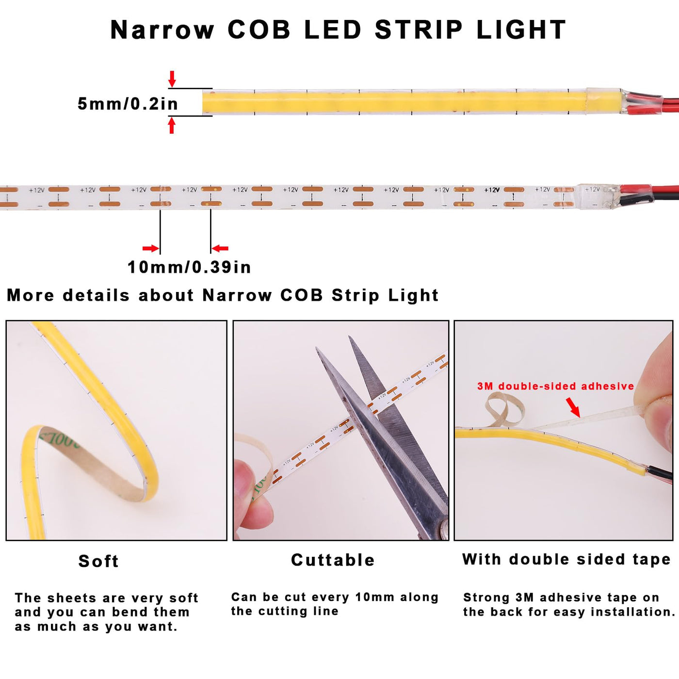 Topai 12V Thin 5Mm Cob Led Strip Waterproof 4000K Natural White 16.4Ft Bright Cri>90 Uniform Dotless 400Leds/M Self Adhesive Fle