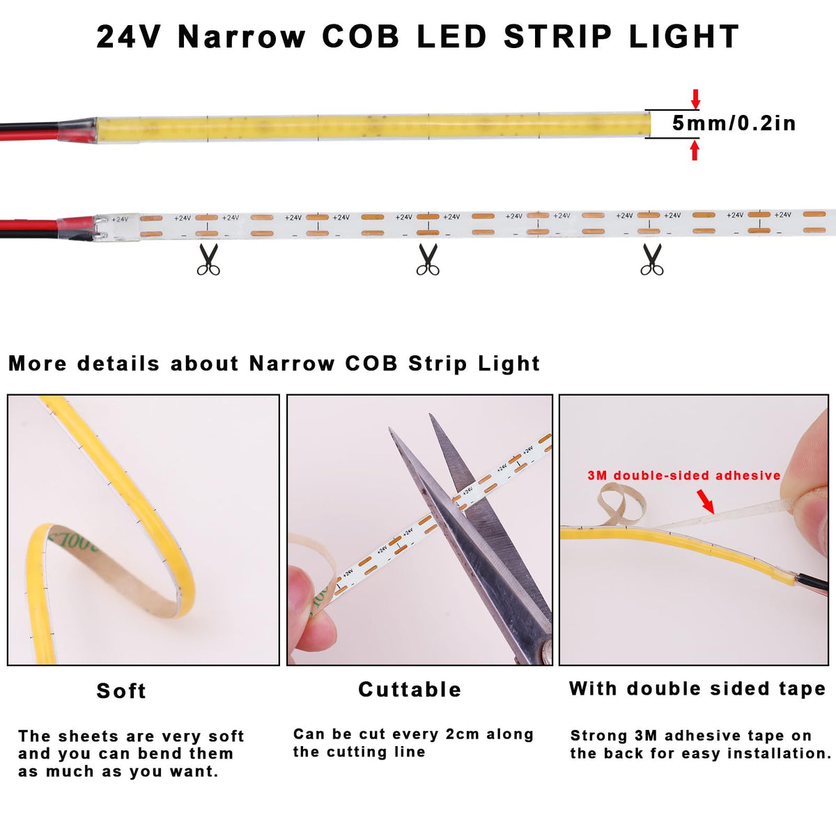 - **Narrow PCB Width**: At only 5mm wide, this COB light strip is designed for easy installation in tight spaces, outperforming ordinary 8mm strips.