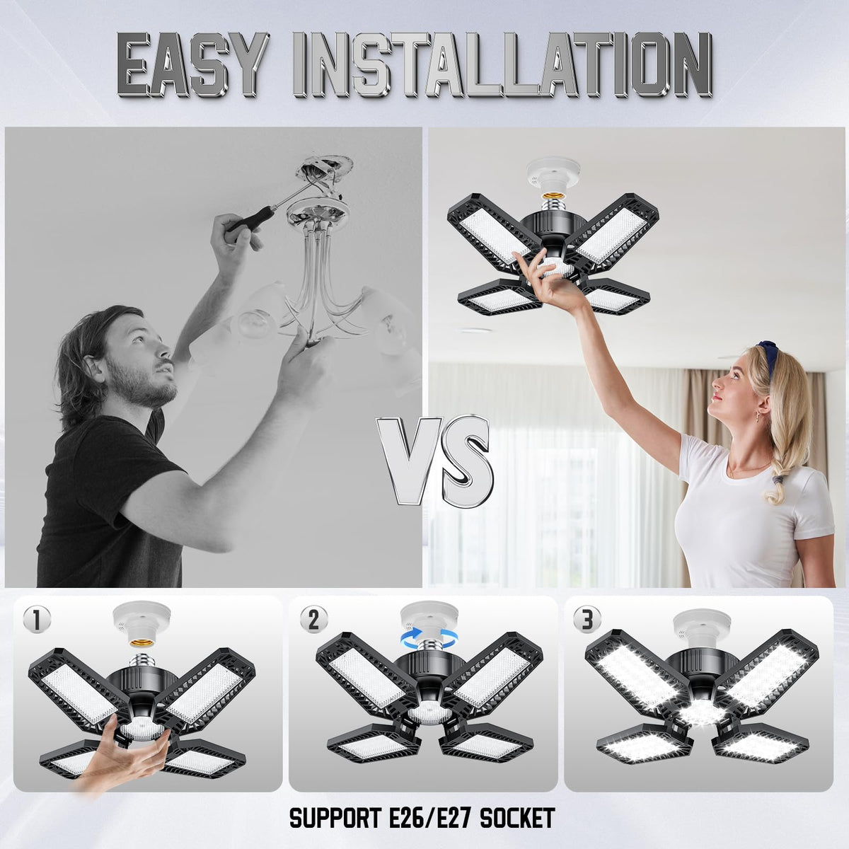 Q: How easy is it to install the screw-in garage light?A: Installation is very straightforward; simply screw the TOPAUBUB Garage Light into a standard E26/E27 socket without any additional wiring or professional help. You can transform your dim garage into a bright workspace in under 30 seconds.
