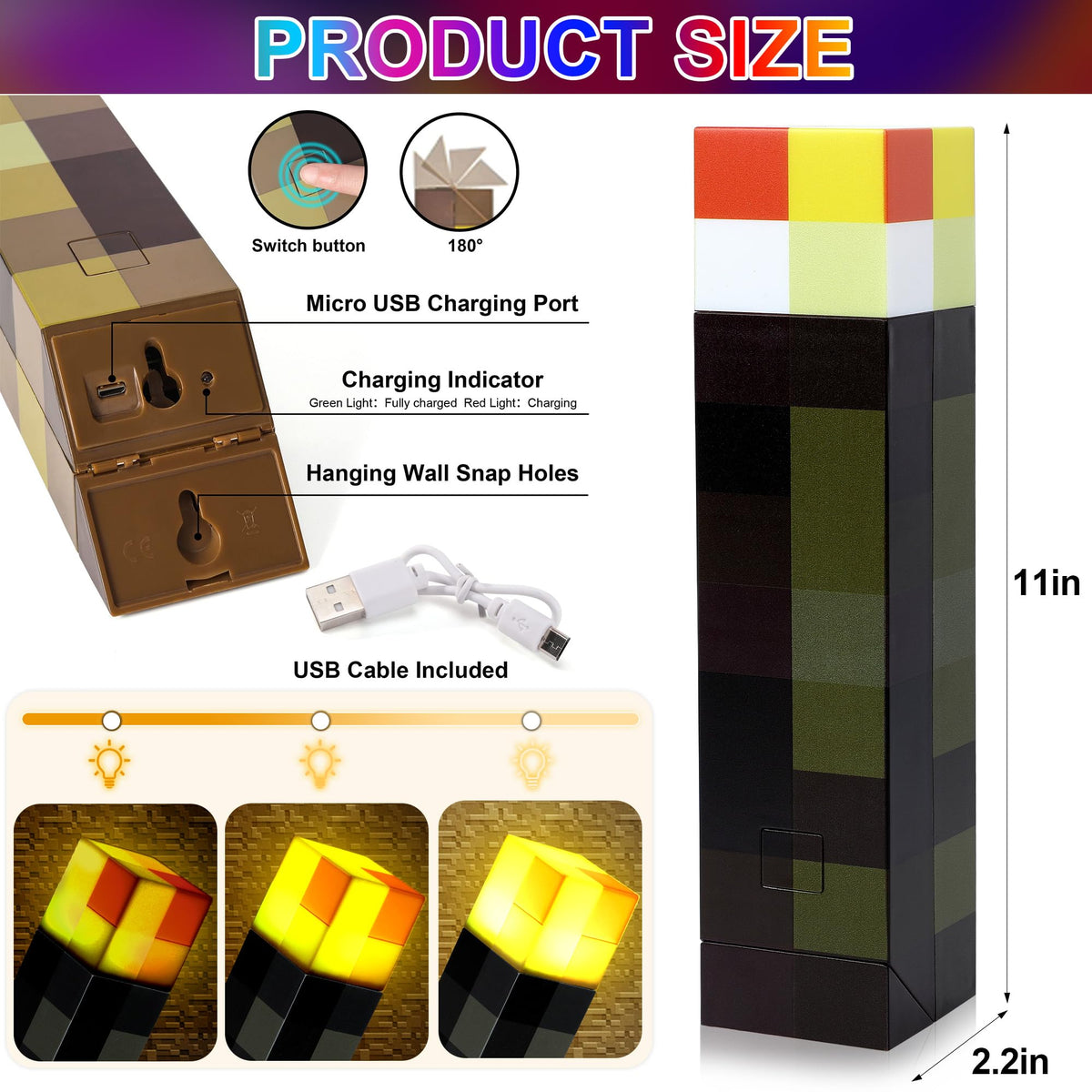 Torch Lamp with Wall Mountable - 3 Lighting Levels LED Night Light, USB Rechargeable for Nightstand Torch Light, Costume Cosplay Nightlight, Kid's Birthday Party Living Room Bedroom Decorations
