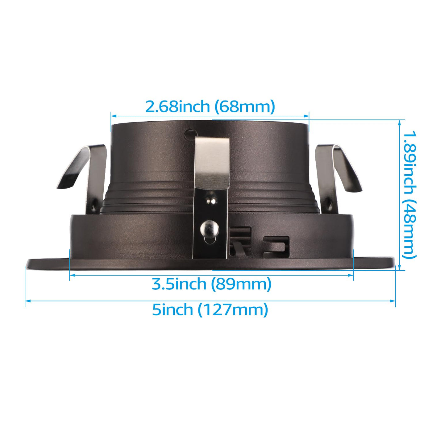 Q: What are the dimensions of the TORCHSTAR light trim?A: The maximum inner diameter of the trim's baffle is 3.5 inches, the top diameter is 2.68 inches, the ring diameter is 5 inches, and the height is 1.89 inches. It's essential to confirm these dimensions for compatibility with your recessed can.