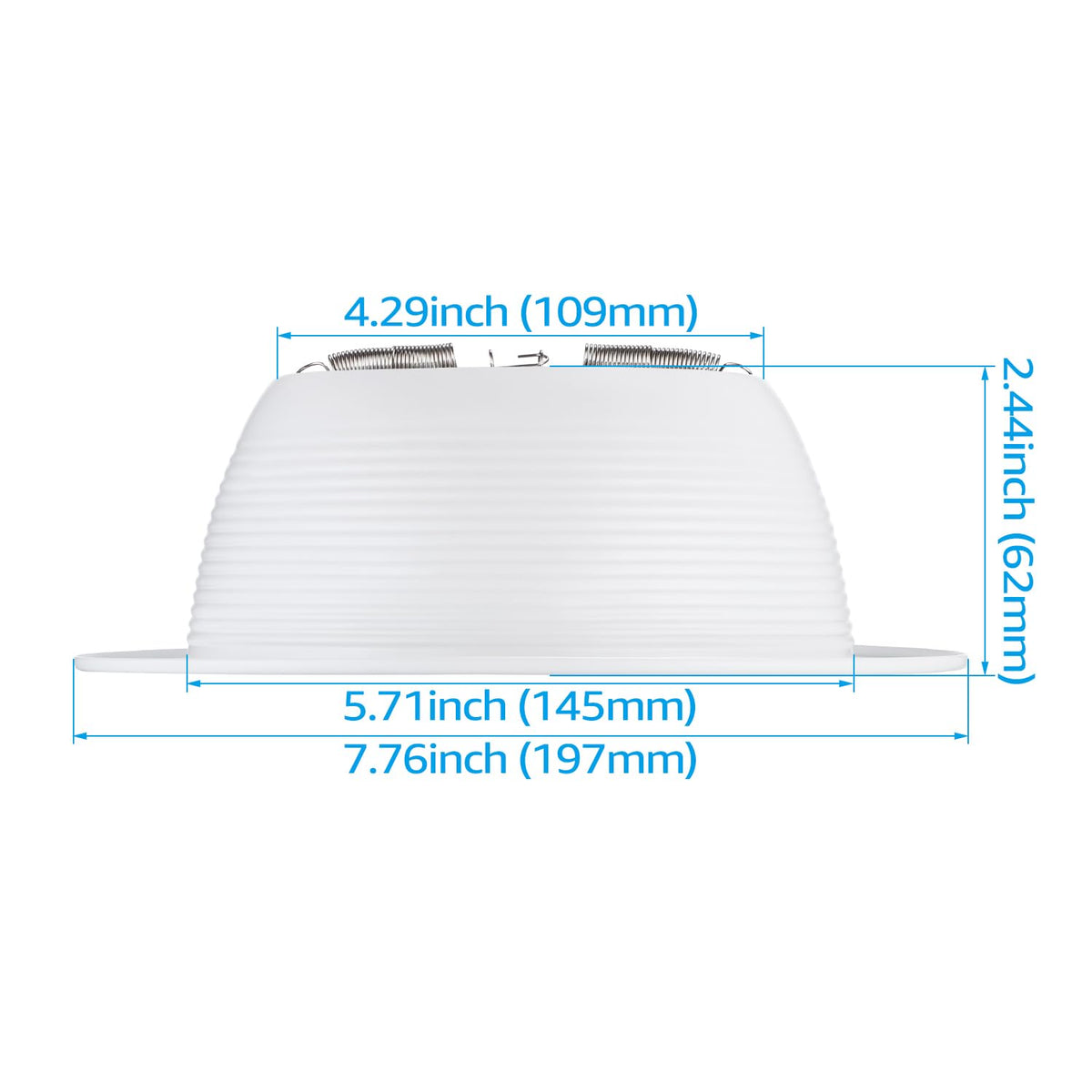 Q: What are the dimensions of the TORCHSTAR recessed light trim?A: The maximum inner diameter of the trim's baffle is 5.71 inches, the top diameter is 4.29 inches, the ring diameter is 7.76 inches, and the height is 2.44 inches. Please confirm these dimensions for compatibility with your recessed can before purchasing.