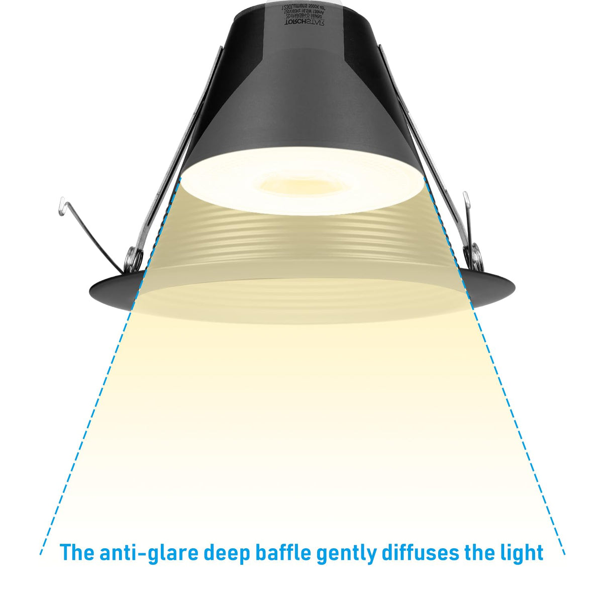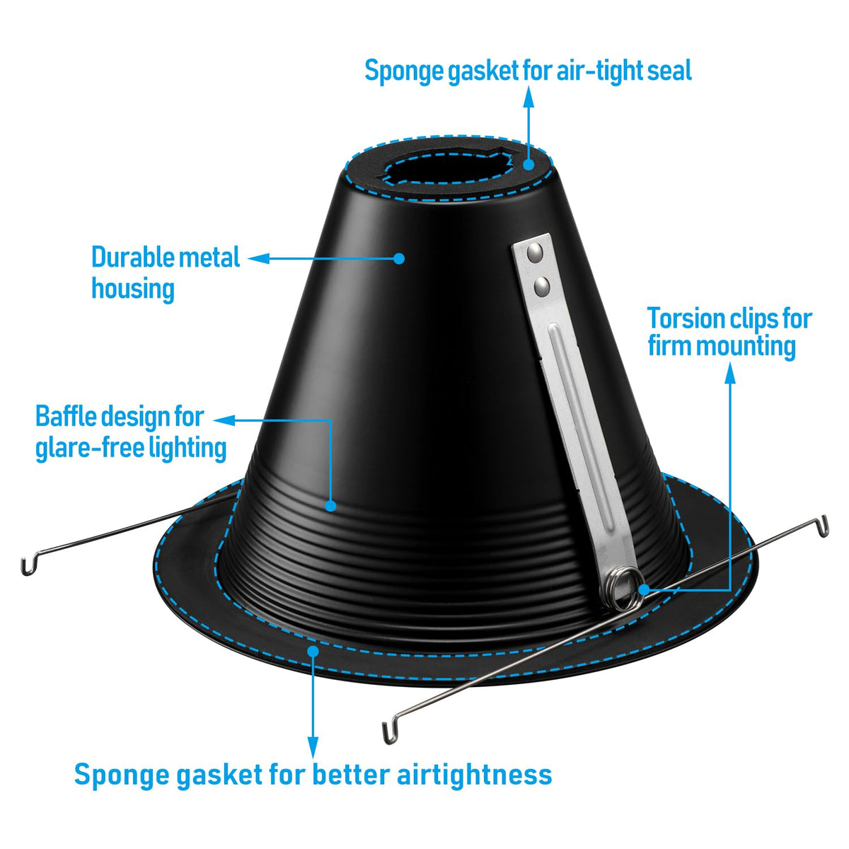 This Newly Launched 6-Inch Recessed Light Trim Kit With Baffle By Torchstar Is Expected To Be Popular Among Most Professional Contractors And Households Due To Its Unique Appearance And Reliable Quality.One-Piece Ring For Covering Gaps:The One-Piece Ring Can Cover Any Gaps Caused By Cutting Errors Or Oversized Holes In The Ceiling, Or To Hide Unsightly Tears And Damage From Removing Existing Decorations.For 6 Inch Cans:This Ceiling Can Light Trim Is Designed For Recessed Cans With An Inner Diameter Of 5.9-6.3 Inches And A Height Of 6-7.25 Inches And Ceiling Lighting Fixtures, And Is Compatible With Par30, Par38, A19, Br30, Br40 And Led Bulbs Of The Same Size.Air Tight Design:This 6-Inch Trim'S Baffle Has A Sponge Sealing Gasket At The Top To Better Block Dust From Entering The Room Through The Ceiling. The Trim Is Airtight If You Use An Airtight Recessed Can. The Black Gasket On The Socket Side Should Be Removed If You Use The Trim With A Non Ic Rated Recessed Can.Specifications:Baffle Color: Black Ring Color: Black Material: Metal Compatible Bulb: Par30, Par38, Br30, Br40, A19, Etc Compatible Recessed Can Type: 6-Inch Cans With E26 Socket