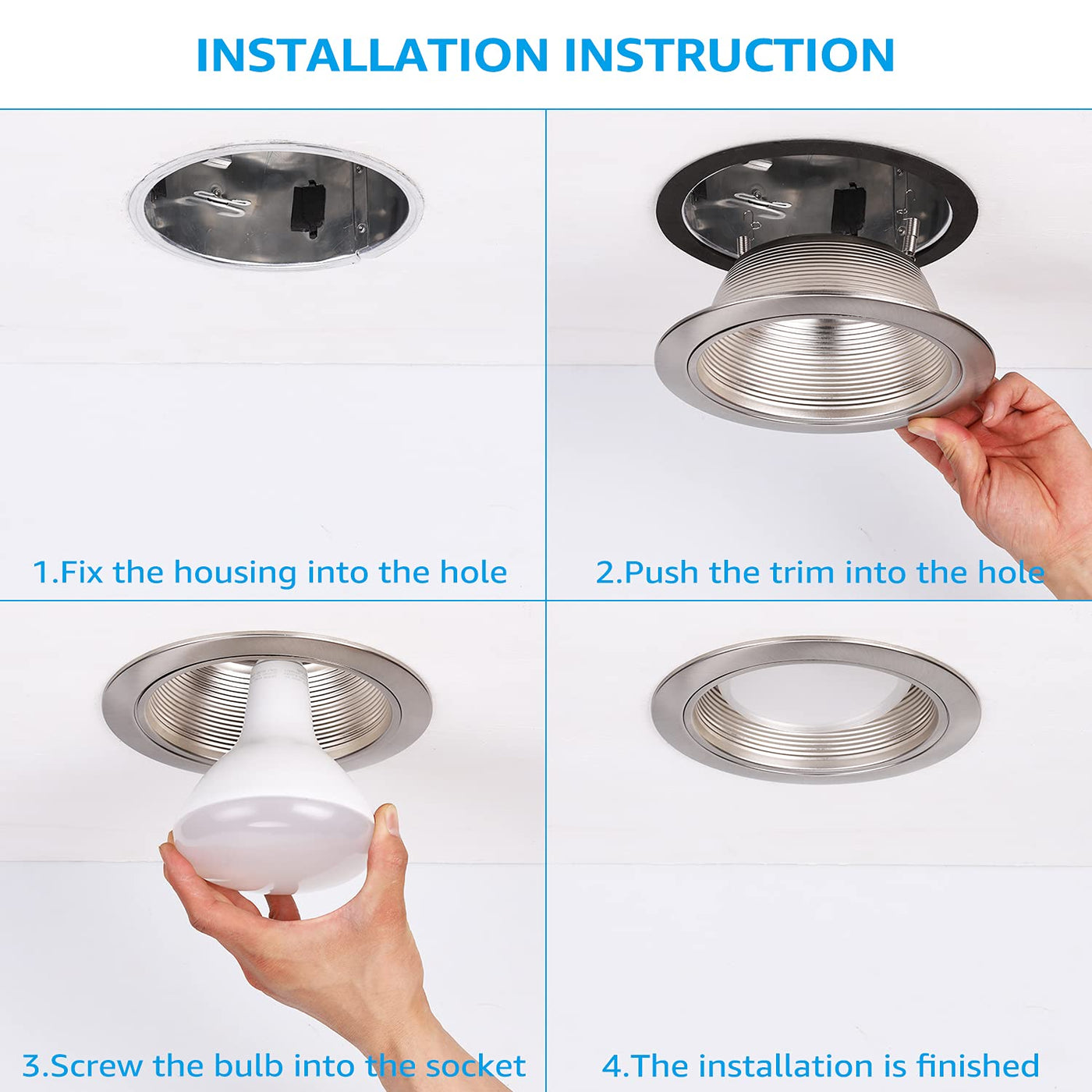 Q: How many trims are included in the package, and what sizes do they fit?A: The package includes 12 trims, designed specifically for standard 6-inch recessed cans, ensuring a perfect fit for Halo/Juno remodel recessed housing.