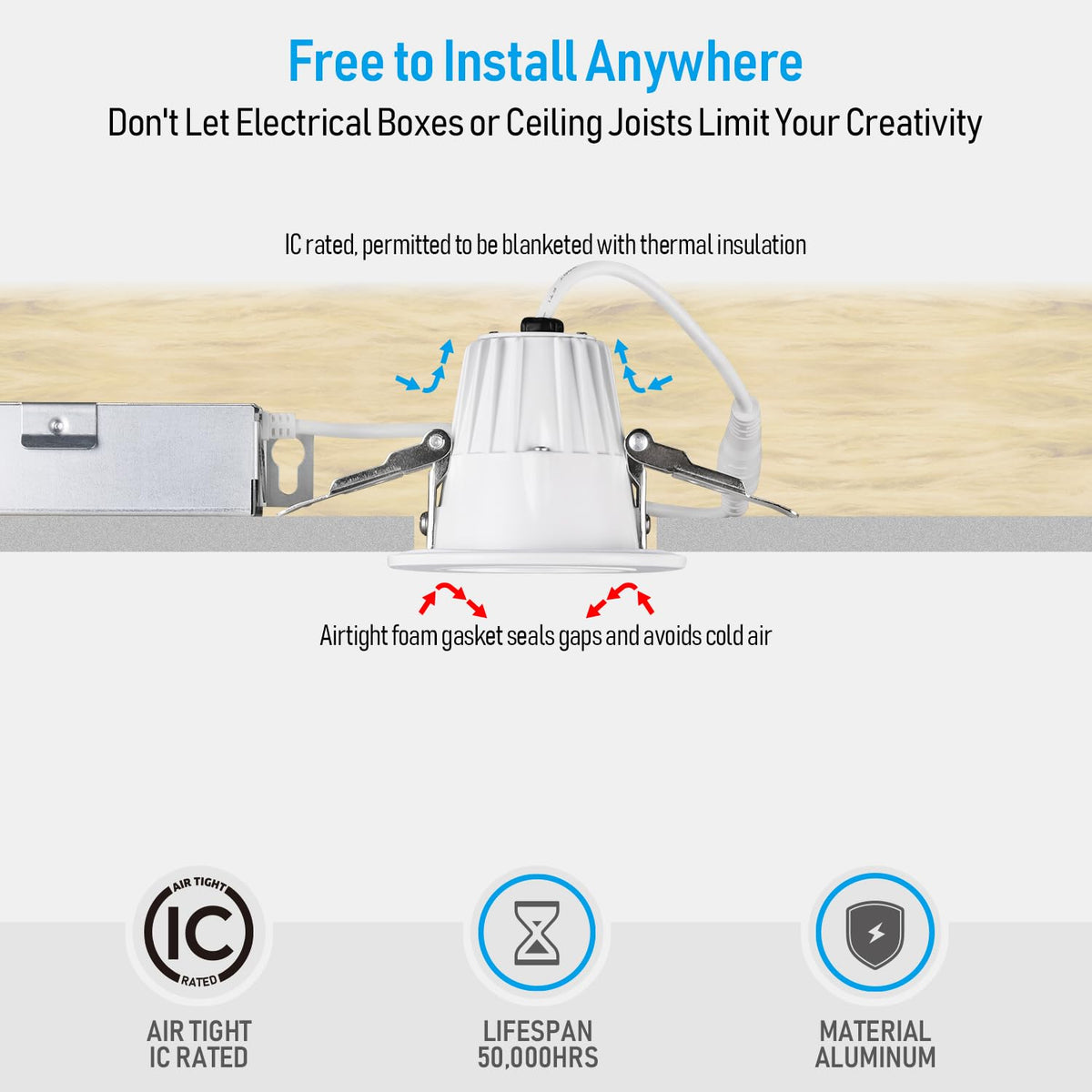 Durable Design Crafted from high-quality die-cast aluminum, this recessed lighting fixture is not only corrosion-resistant but also offers excellent heat dissipation. Its IC rating enables safe installation in contact with insulation, ensuring your home remains energy efficient. The airtight design prevents heated airflow from disrupting your air conditioning and heating systems, making this downlight a reliable choice for any room. Additionally, the spring clips securely attach to ceilings up to 1 inch thick, simplifying installation.