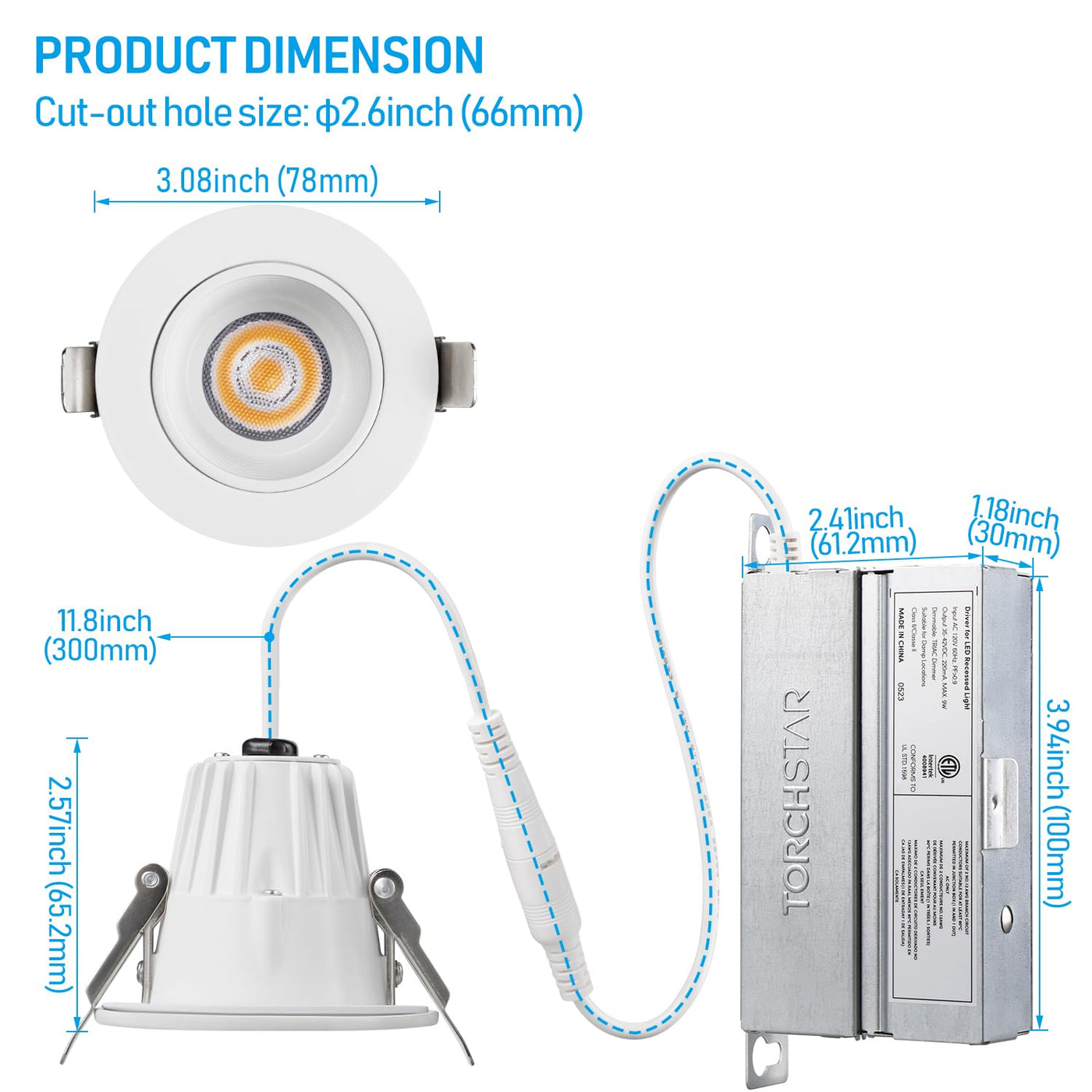 TORCHSTAR 2 Inch LED Recessed Lighting, 600lm, Dimmable, Warm White (3000K), IC Rated, ETL, Energy Star, 6 Pack
