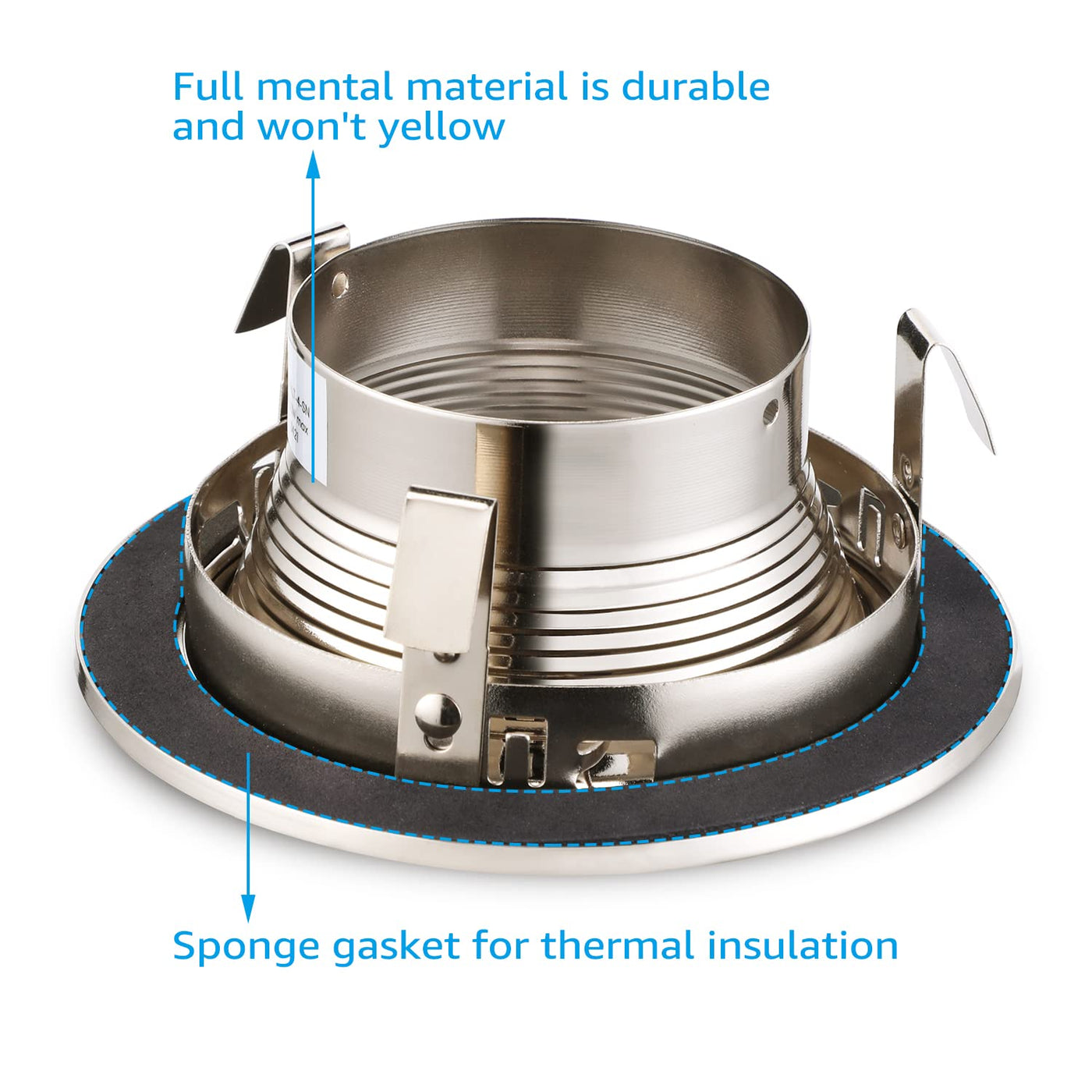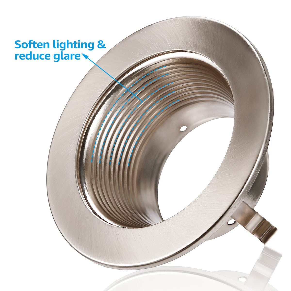 This New Arrival 4 Inch Light Trim Is Preferred By Most Contractors And Electricians. This Owe To Its Considerate Design And Reliable Quality. This Light Trim Is Designed For 4 Inch Standard Recessed Cans And Ceiling Lighting Fixtures, And Used With Par16, Par20, R20 And Same Size Halogen, Incandescent And Led Light Bulbs. It Can Be Used For Covering Gaps From Mis-Cut And Over-Sized Holes, Or Covering Unsightly And Torn Drywall Caused By The Removal Of Existing Trim. The 4 Inch Light Trim Has Satin Nickel Metal Step Baffle To Create The Soft Light Effect. It Is Made By Durable Metal Construction, Which Can Use Many Years Than Other Plastic Trim, Without Aging Or Turning Yellow. The Trim Is Easy And Fast Installed; It Is Plug-N-Play And Use Retention Clips To Hold Trim Firmly To Housing. Specifications: Baffle Color: Satin Nickel Ring Color: Satin Nickel Compatible Bulb Type: Par16, Par20, R20 Compatible Recessed Can Size: 4 Inch
