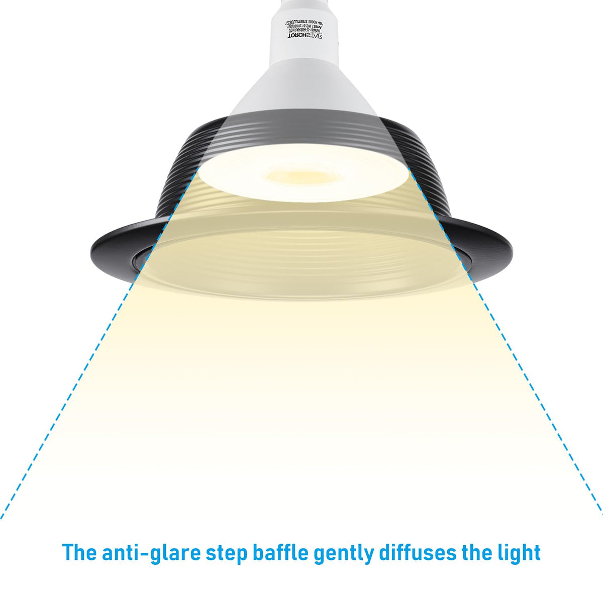 Q: How does the step baffle design improve lighting quality?A: The step baffle design of the TORCHSTAR trim reflects light from the bulb, creating a softer and well-balanced illumination. This helps to reduce glare, minimizing eye irritation and fatigue, making it ideal for residential and commercial spaces.
