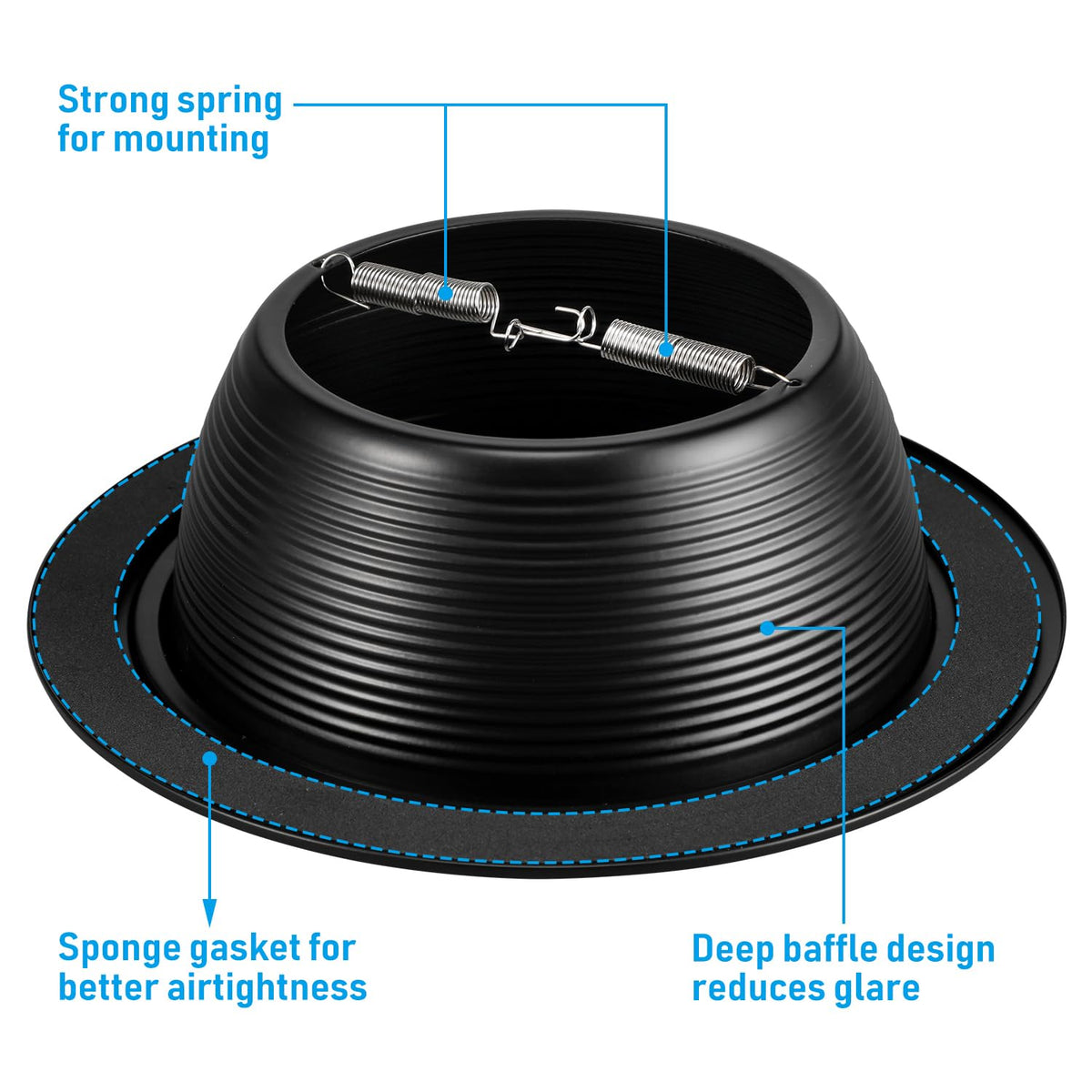 This Newly Launched 6-Inch Recessed Light Trim Kit With Baffle By Torchstar Is Expected To Be Popular Among Most Professional Contractors And Households Due To Its Unique Appearance And Reliable Quality.Detachable Ring For Covering Gaps:This Recessed Lighting Trim Features A Detachable Ring That Covers Any Gaps Caused By Cutting Errors Or Oversized Holes In The Ceiling, Or To Hide Unsightly Tears And Damage From Removing Existing Decorations.For 6 Inch Cans:This Ceiling Can Light Trim Design Is Intended For Use With Standard 6-Inch Recessed Cans And Ceiling Lighting Fixtures, And Is Compatible With Par30, Par38, R30, R40 And Led Bulbs Of The Same Size.Durable Construction:The 6-Inch Baffle Trim Is Made Of Durable Metal Material That Lasts Longer Than Plastic Trims, And Will Not Age Or Yellow Over Time. It Is Easy And Quick To Install, With Two Springs At The Top Of The Baffle Securely Attaching To The Can, Blocking Dust From Entering The Room Through The Ceiling.Specifications:Baffle Color: Black Ring Color: Black Material: Metal Compatible Bulb: Par30, Par38, R30, R40, Etc Compatible Recessed Can Type: 6-Inch Cans