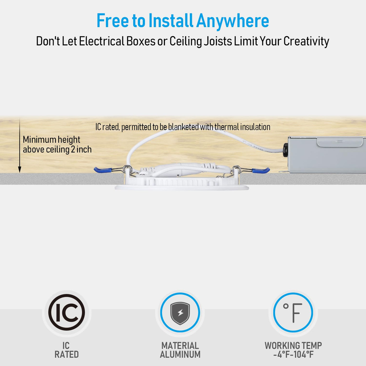 If You'Re Troubled By Small Space In Your Ceiling, This Soft White Recessed Ultra-Thin Light Offers An Efficient Solution.Slim Design:Perfect For Ceilings With Limited Space, This Recessed Slim Panel Led Downlight Requires Only 2 Inches Of Clearance, Suitable For Retrofit, Remodeling, Or New Construction Installations.Easy Installation:Install This Ultra-Thin Light From Below The Ceiling. The Spring Clips Secure The Light To Ceilings Up To 0.59 Inches Thick.Specifications Wattage: 10W Voltage: 100-130V Cri: 80 Luminous Flux: 650Lm Cct: 2700K Soft White Dimmable: Yes Surface Size: 4.72 Inches Back Hole Size: 4.25 Inches Lifespan: 36,000Hrs Material: Aluminum, Pc