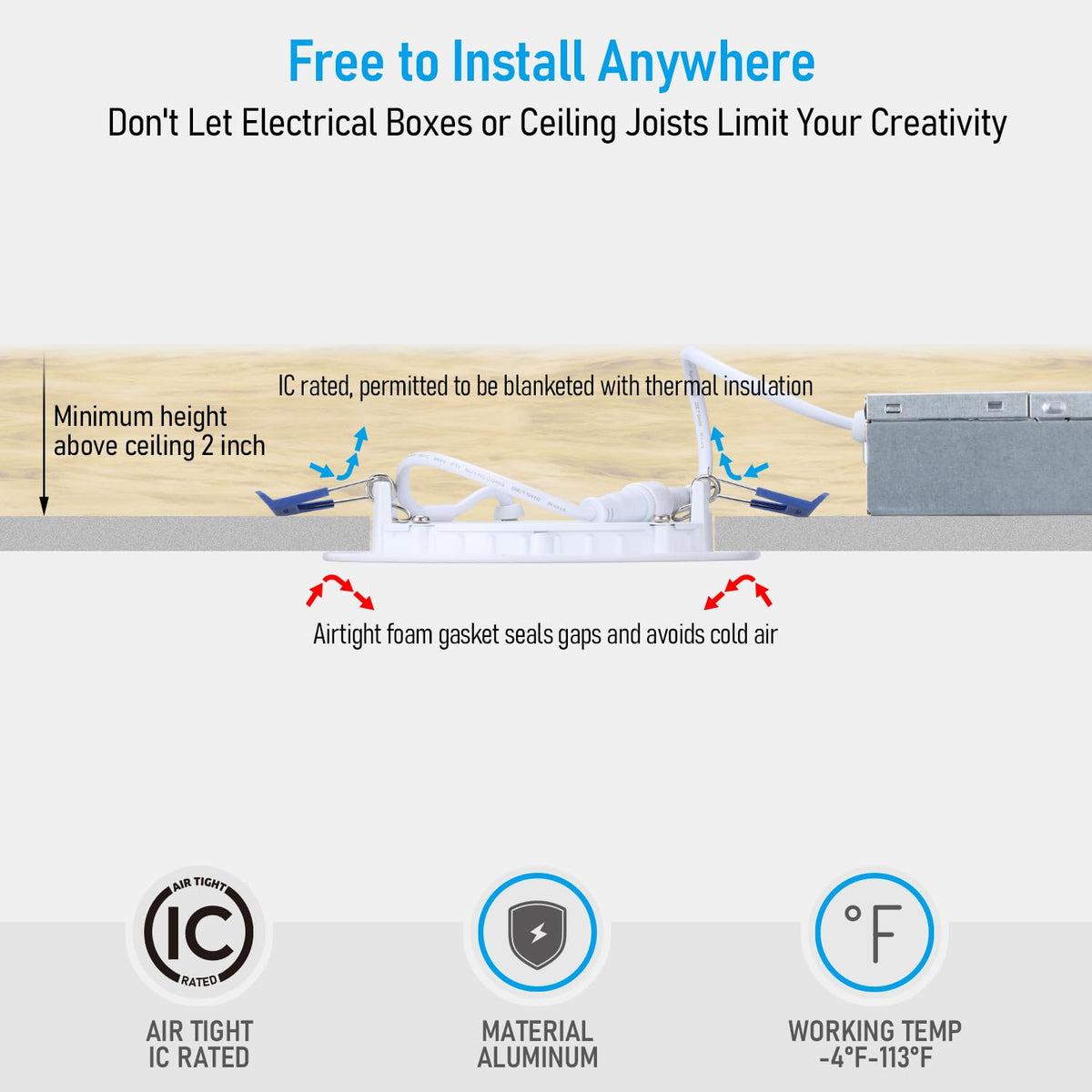 If You?E Troubled By Small Space In Your Ceiling Or High Energy Costs, Then This Cool White Recessed Ultra-Thin Light Is Your Must-Have Solution.Slim Design:For Those Whose Ceilings Are Too Small For Standard Led Flush Light Panels, We Launched This Recessed Slim Panel Led Downlight. Only Needing 2 Inches Of Clearance, This Bight Light Supports Retrofit, Remodeling, Or New Construction Installations.Switch And Save:Using Less Energy Compared To Incandescent And Halogen Bulbs, This 12-Pack Can Save You On Energy Over Its 50,000Hrs Lifespan.Easy Installation:The Ultra-Thin Design Allows You To Install This Light From Below The Ceiling. Only 2 Inches Of Clearance Is Needed, Making This Light Perfect For Retrofit, Remodel Or New Construction Installation.Specificationspower: 9Wvoltage: 100-130Vcri: 90Luminous Flux: 800Lmcct: 4000K Cool Whitedimmable: Yesdimming Range: 5%-100%Lifespan: 50,000Hrswaterproof Rating: Damp Locationworking Temp: -4?-113?Material: Aluminum