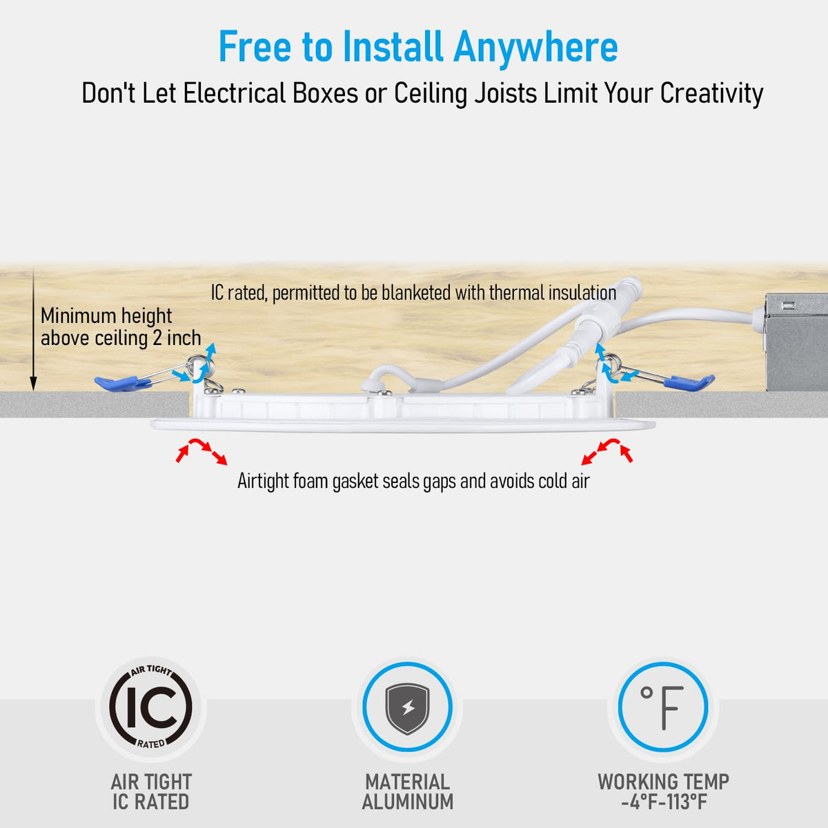If You?E Troubled By Small Space In Your Ceiling Or High Energy Costs, Then This Daylight Recessed Ultra-Thin Light Is Your Must-Have Solution.Slim Design:For Those Whose Ceilings Are Too Small For Standard Led Flush Light Panels, We Launched This Recessed Slim Panel Led Downlight. Only Needing 2 Inches Of Clearance, This Bight Light Supports Retrofit, Remodeling, Or New Construction Installations.Switch And Save:Using Less Energy Compared To Incandescent And Halogen Bulbs, This 12-Pack Can Save You Up To $6,273 On Energy Over Its 50,000Hrs Lifespan.Easy Installation:The Ultra-Thin Design Allows You To Install This Light From Below The Ceiling. Only 2 Inches Of Clearance Is Needed, Making This Light Perfect For Retrofit, Remodel Or New Construction Installation.Specificationspower: 12Wvoltage: 100-130Vcri: 90Luminous Flux: 1100Lmcct: 4000K Cool Whitedimmable: Yesdimming Range: 5%-100%Lifespan: 50,000Hrswaterproof Rating: Damp Locationworking Temp: -4?-113?Material: Aluminum