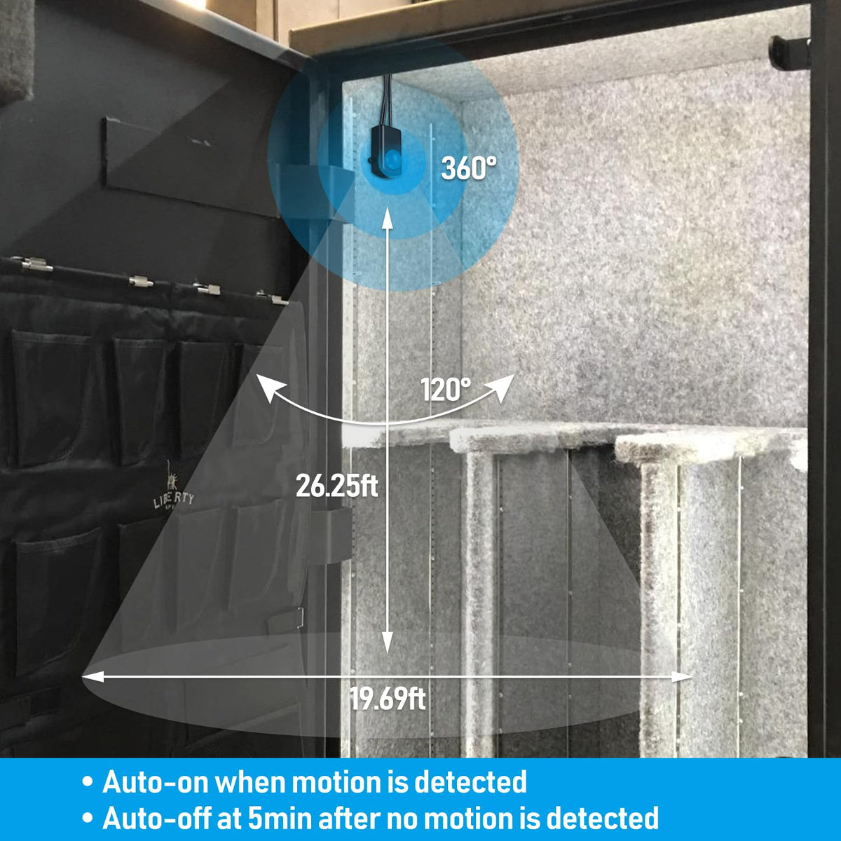 Q: How does the motion sensor work in this lighting kit?A: The motion sensor detects movement within a range of 26.25 feet, automatically turning on the lights when it senses motion and shutting them off after 5 minutes of inactivity.