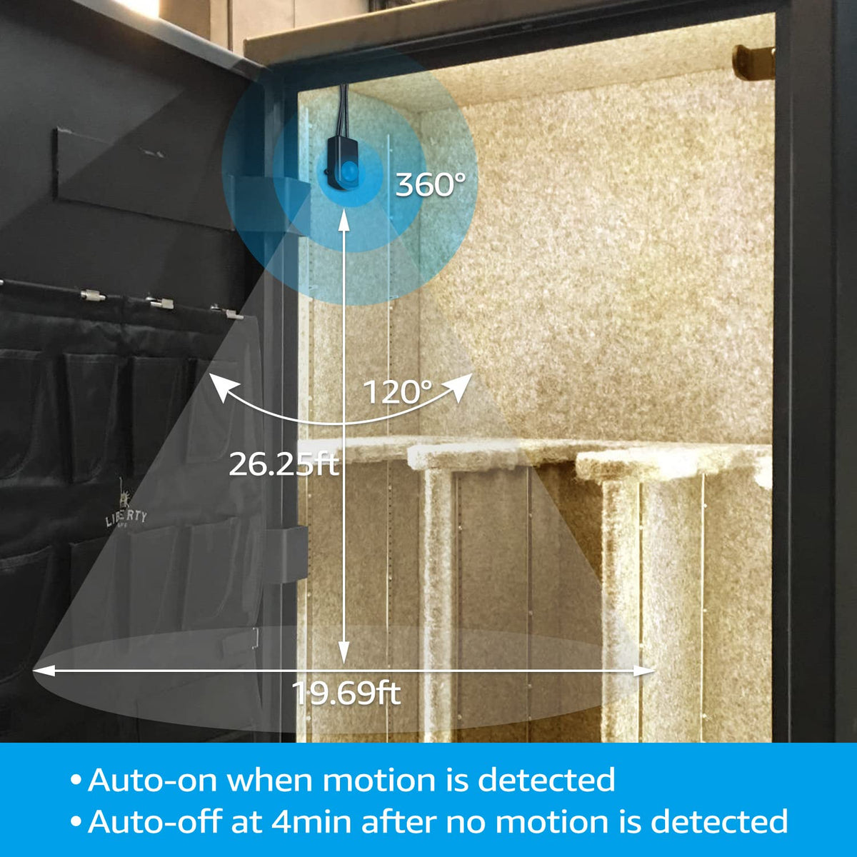 Q: How does the motion sensor feature work on this lighting kit?A: The motion sensor on the TORCHSTAR LED Safe Lighting Kit detects movement within a range of 26.25 feet. Once it senses movement, the lights turn on immediately, providing bright illumination. If no movement is detected for 4 minutes, the lights will automatically shut off to conserve energy.