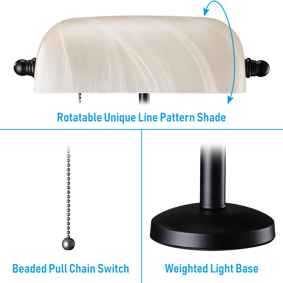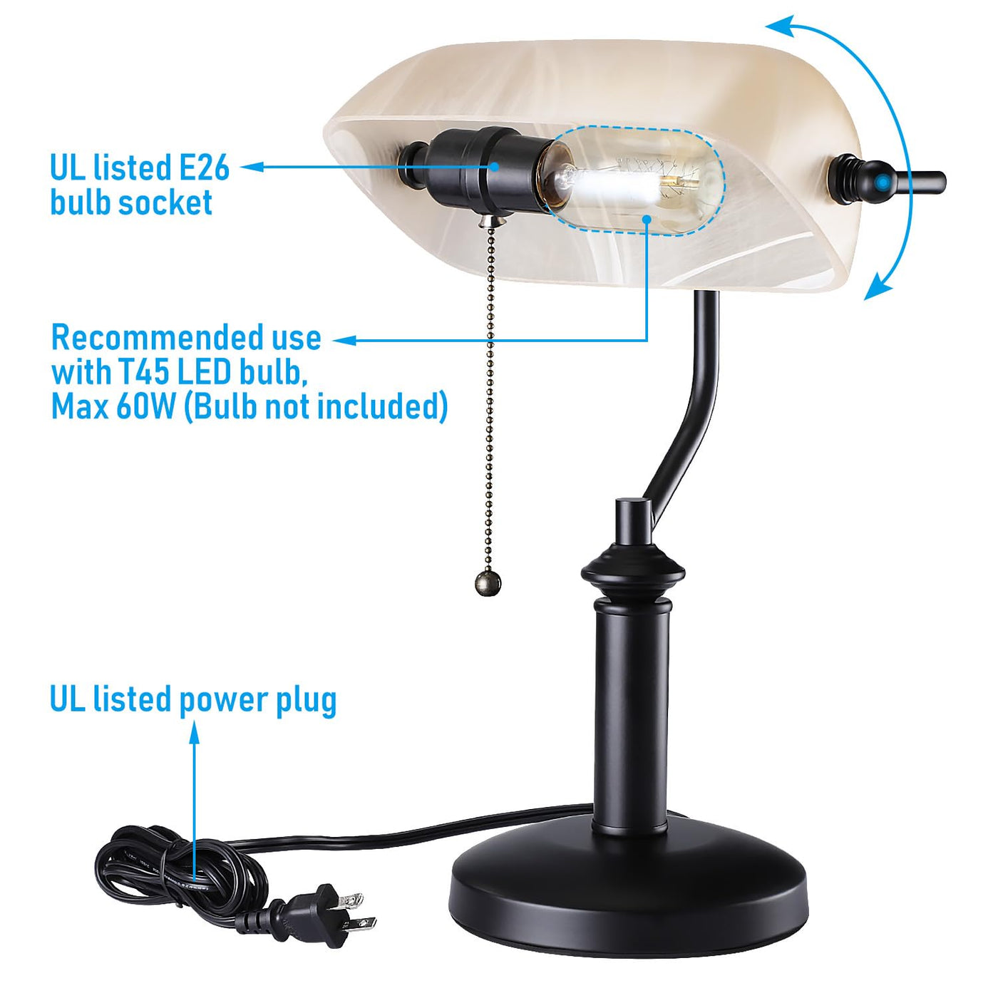 This Light Combines Excellent Lighting With Beautiful Style To Create A Timeless Decorative Piece. The Elegant Design Carefully Disguises The Carefully Selected, Durable Material, Letting This Lamp Last A Long Time. Amazing Features - The Thickened Glass Lampshade Is More Durable And Increases The Decorative Effect. - The Metallic Lamp Body'S Rust And Decay. - The Lampshade Can Be Rotated 290?, Creating A More Flexible And Versatile Lighting Direction. - The Attached Aged Metal Beaded Pull Cord Switch Is Easy To Use. Plug-N-Play For Easy, Zero Fuss Setup. 5.4Ft Long Power Cord Easily Connects To Power Outlets. Compatible With Standard E26 Base Light Bulbs Within 60W. The Ul-Listed Power Plug Is Safe To Use. 3 Years Warranty Comes Included, Satisfaction Guaranteed. Where To Use Offices/Meeting Rooms Libraries/Reading Rooms/Study Rooms Living Rooms/Bedrooms Display Cases/Book Shelves Note: The 290? Rotatable Lampshade Allows For Flexible Lighting Effects And Convenient Bulb Replacement. Please Handle The Lampshade Gently As It? Hand-Blown Glass Material.