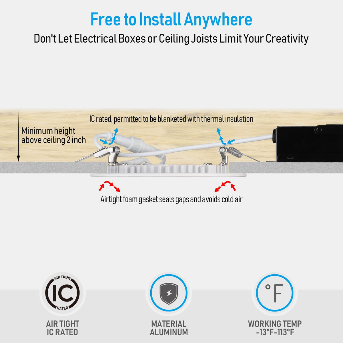 Safety Embrace: Safety is at the heart of our design. The recessed lighting boasts an IC rating, meaning it can cozy up to insulation without sparking fire fears. Rest assured as you install it seamlessly into your ceiling or insulated spaces, creating an aura of security | Eco-Friendly Brilliance: Torchstar LED recessed light with the coveted Energy Star certification, sips a mere 10.5 watts of power while casting a radiant 680 lumens of light. Imagine replacing those power-hungry 50W incandescent bulbs and pocketing savings of up to $1042.8 over its impressive 40,000hrs lifespan | Ultra-Thin and Easy Installation: With an ultra-slim design, the light has a thickness of only 0.39 inches for the light body and 1.23 inches for the junction box. It can be perfectly installed with just a 2-inch height requirement. Installation is a breeze – simply connect the junction box to the light and secure it to the ceiling using the all-metal spring clamps | Smooth Dimming: Customize your ambiance with the flick of a switch. Our slim downlight offers a dimming range from a cozy 10% glow to a brilliant 100% radiance. Let your lighting preferences shape your mood and atmosphere | Enduring Excellence: Crafted for longevity, our ceiling can light bears the ETL certification for light and UL certification for cords and plugs. The aluminum body is not just stylish but also excels at dissipating heat, ensuring a prolonged service life