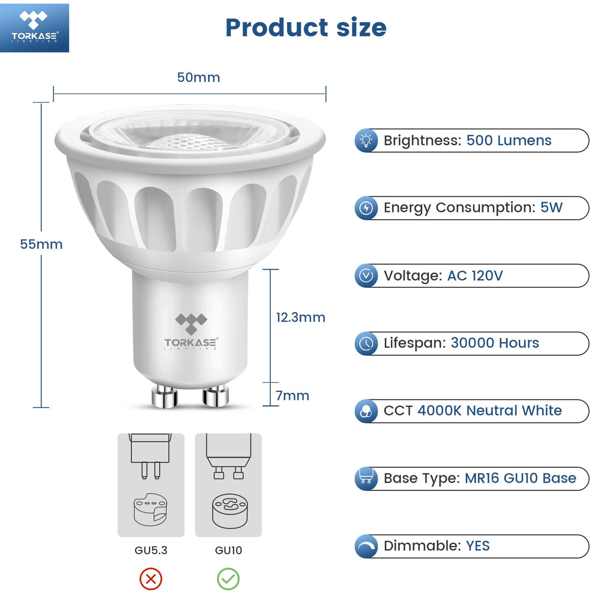 Torkase Dimmable Mr16 Led Light Bulb,Gu10 Base,120V,4000K Neutral White,5W(50W Halogen Replacement),500Lm,40 Narrow Beam Range H
