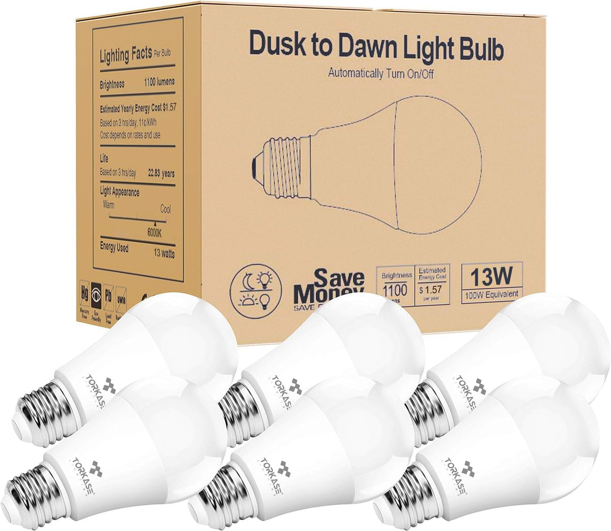Torkase Outdoor Dusk To Dawn Light Bulbs, Smart Sensor Led Lighting Bulb 13W(100W Equivalent), E26 6000K,6 Pack Built-In Photocell Detector, Automatic On/Off,For Porch Hallway Garage Boundary
