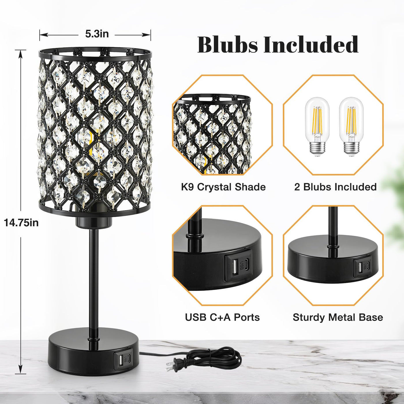 Touch Control Table Lamp, Black Crystal Table Lamps Set Of 2 With 2 Usb Charging Ports, 3-Way Dimmable Bedside Nightstand Lamps