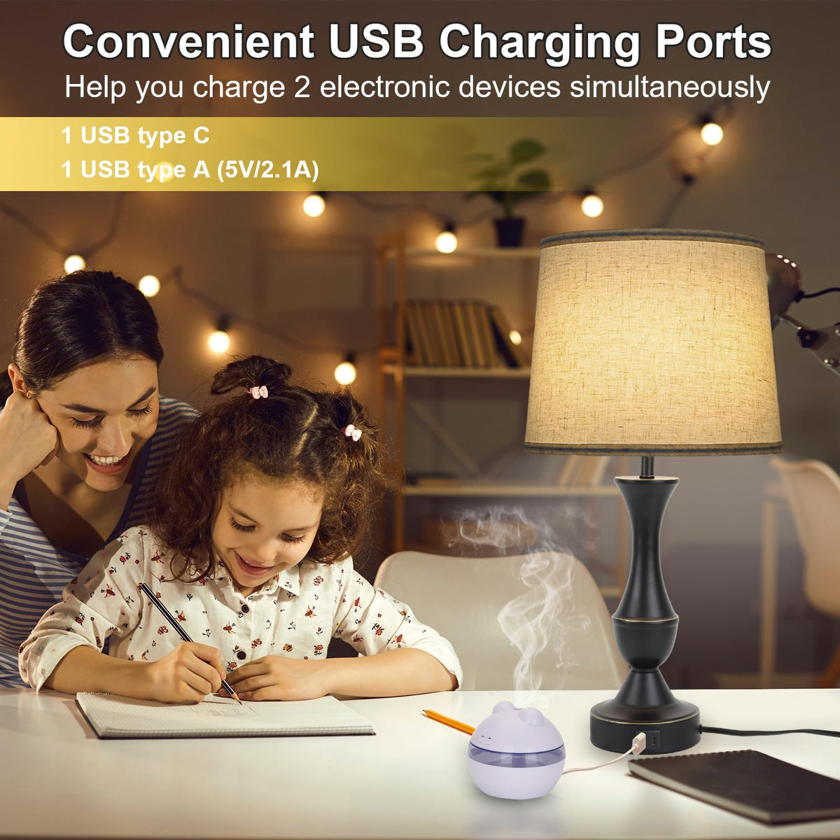 Q: How do the USB charging ports work on these lamps?A: Each lamp is equipped with both a USB Type C and a USB Type A charging port, allowing you to charge multiple devices like smartphones, tablets, and e-readers effortlessly while using the lamp.