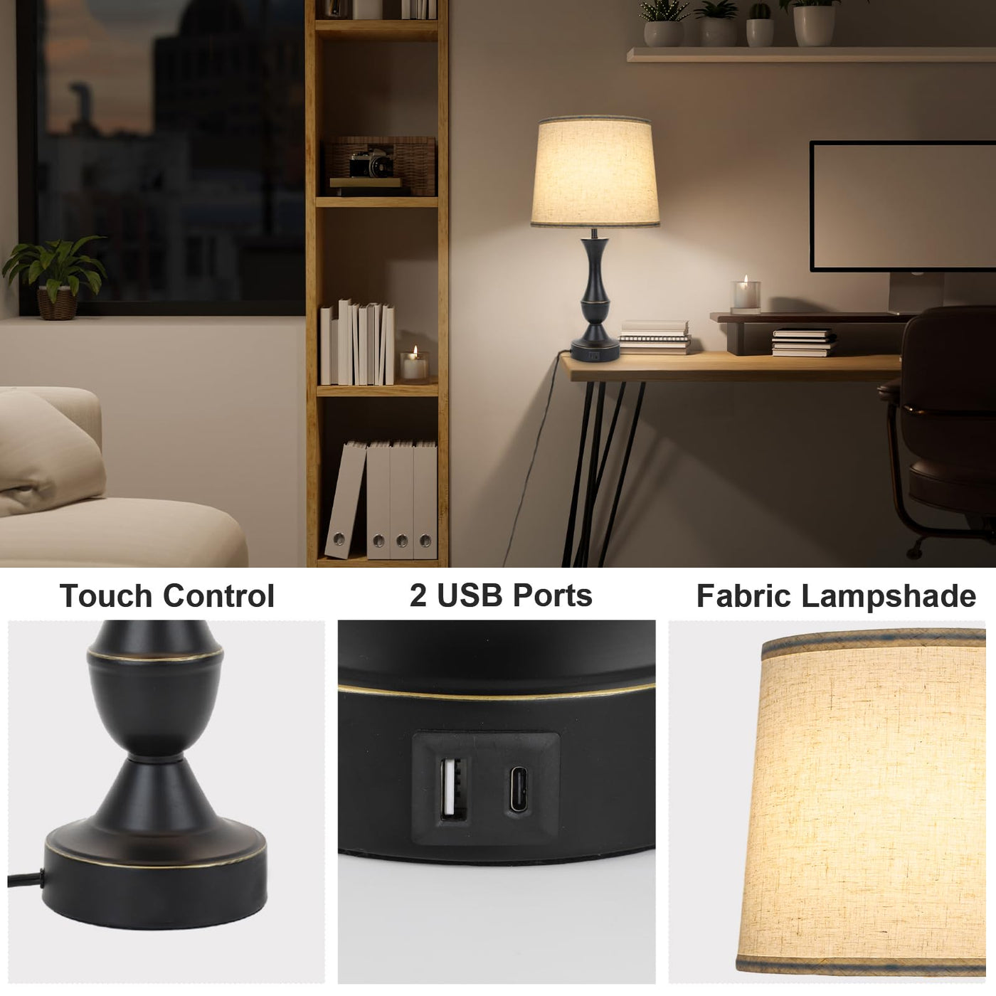 Q: What type of light bulbs do these lamps use?A: The Touch Lamps come with two E26 LED bulbs included, providing warm white light equivalent to 60W, which is energy-efficient and designed to create a cozy atmosphere.