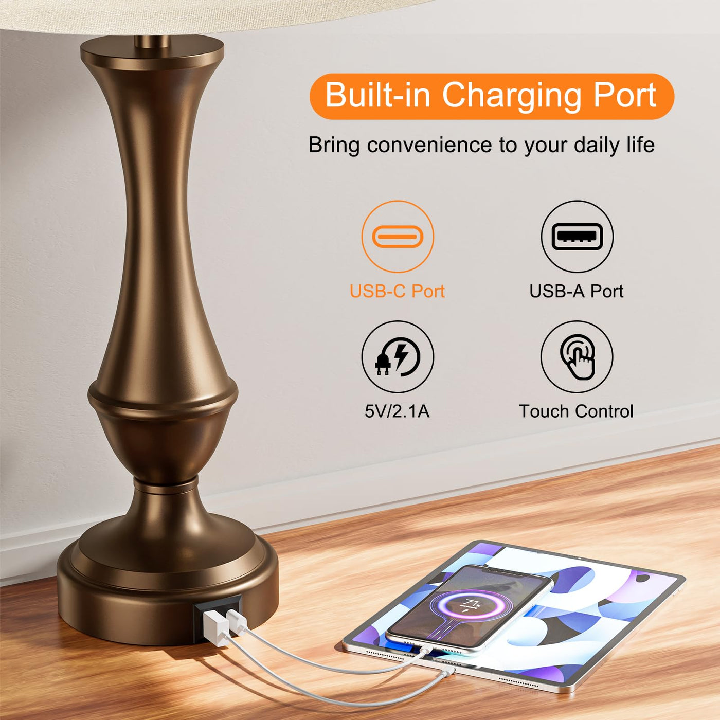 Touch Lamps For Bedrooms Set Of 2 - Nightstand Table Lamp With Usb C+A, 3 Way Dimmable Bedside Lamps For Living Room End Tables
