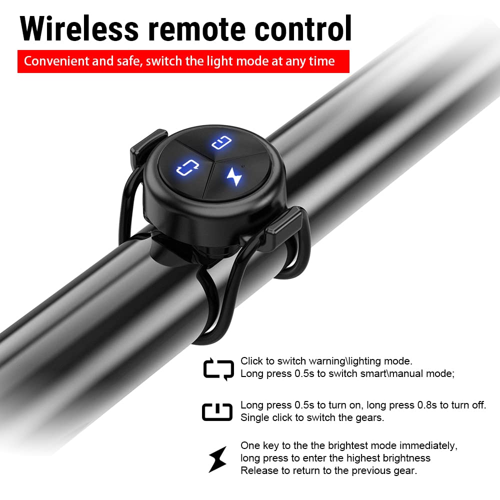 Q: How does the remote control work for this bike light?A: The remote control allows you to easily adjust the brightness, switch between modes, and check the power status with just a touch. This feature provides convenience and quick response in emergencies, much like controlling a car's headlights.