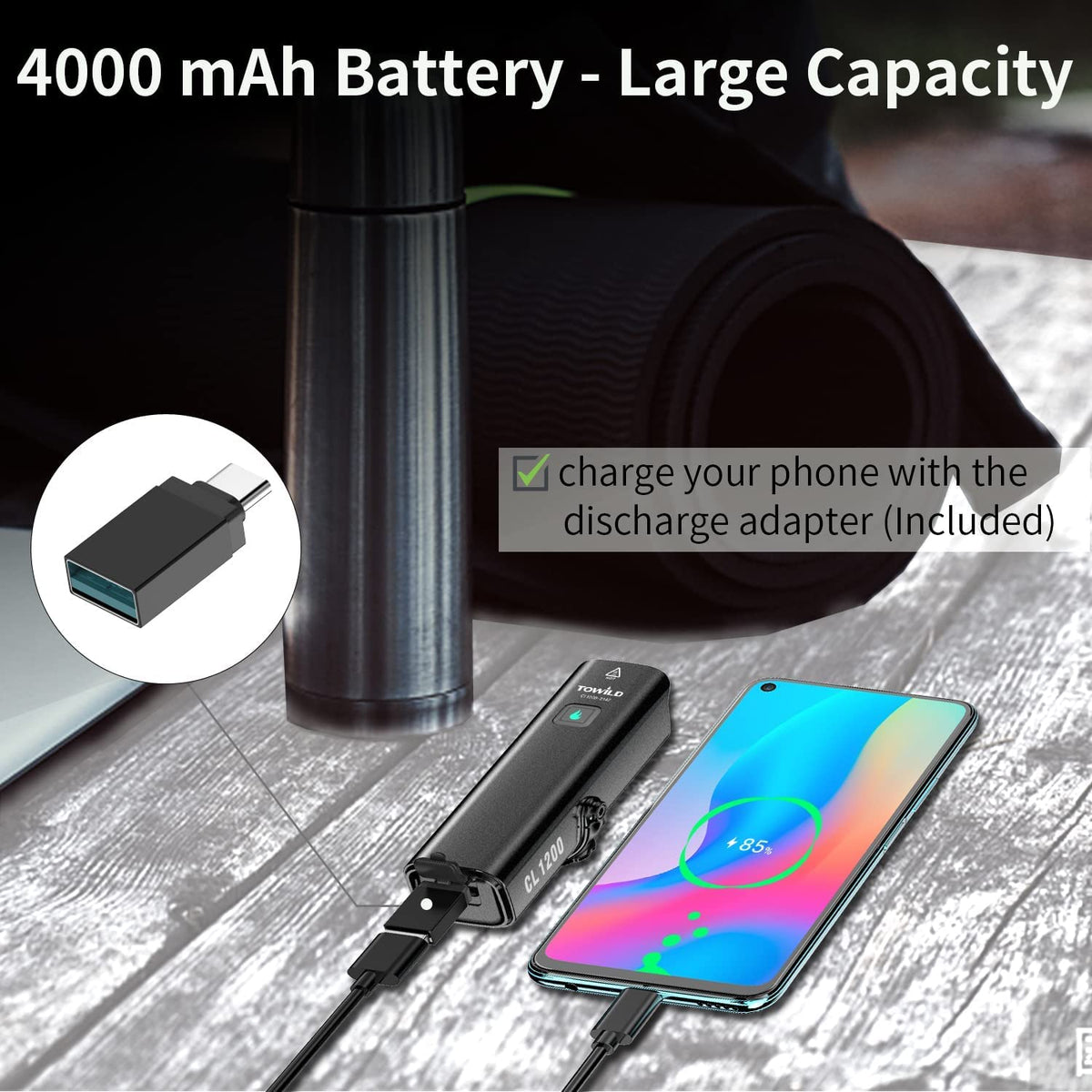 Q: How long does the battery last on a full charge?A: The rechargeable battery with 4000mAh capacity provides up to 6.5 hours of use at 300 lumens, 3 hours at 600 lumens, and 1.75 hours at the maximum brightness of 1200 lumens. It fully charges in about four hours using a USB-C cable.