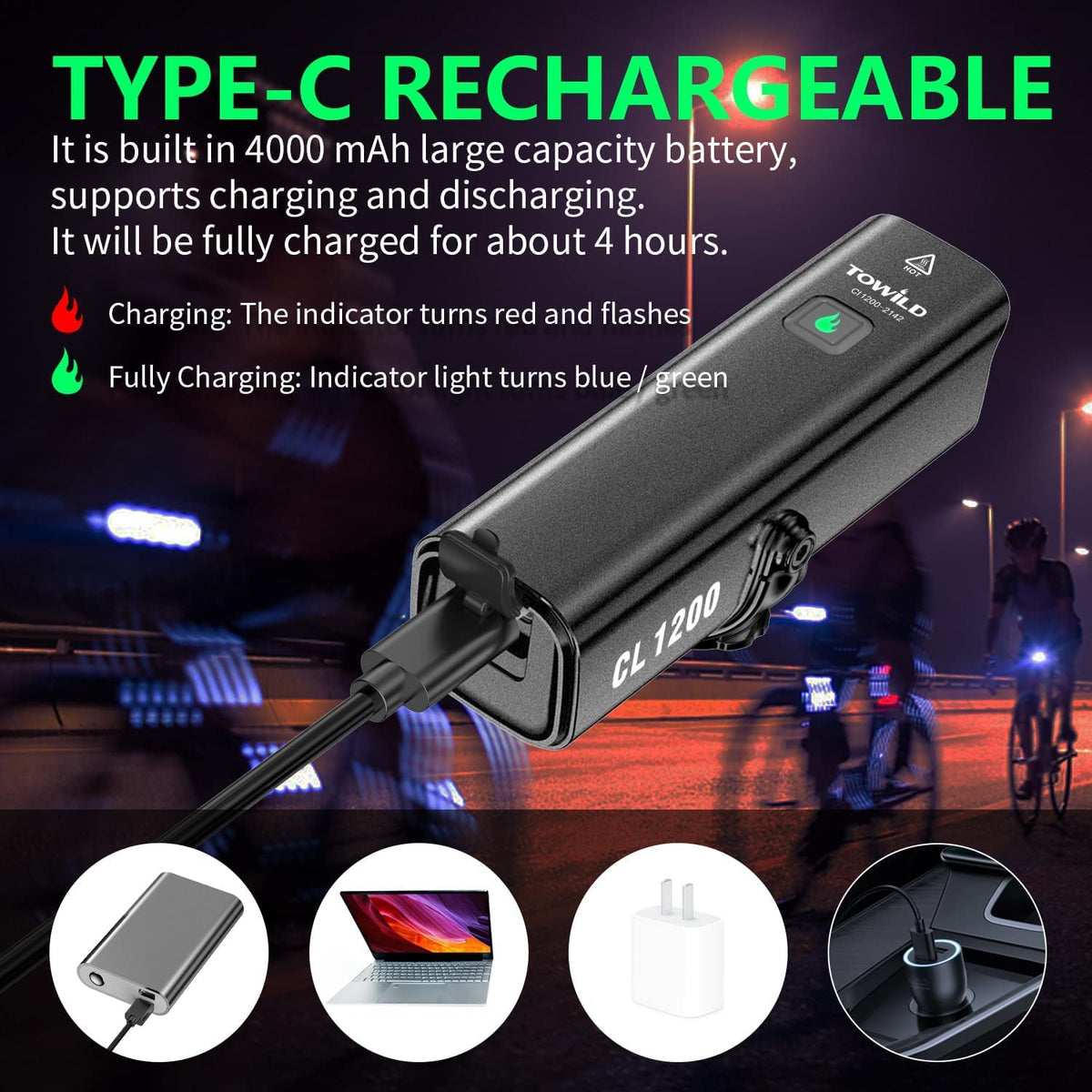 Q: What are the brightness levels available for the TOWILD Bike Light?A: The TOWILD Bike Light features 5 different brightness modes, including a maximum output of 1200 lumens, which allows for clear visibility during night rides. The modes include 300 lumens for commuting, 600 lumens for medium brightness, and 1200 lumens for high brightness.