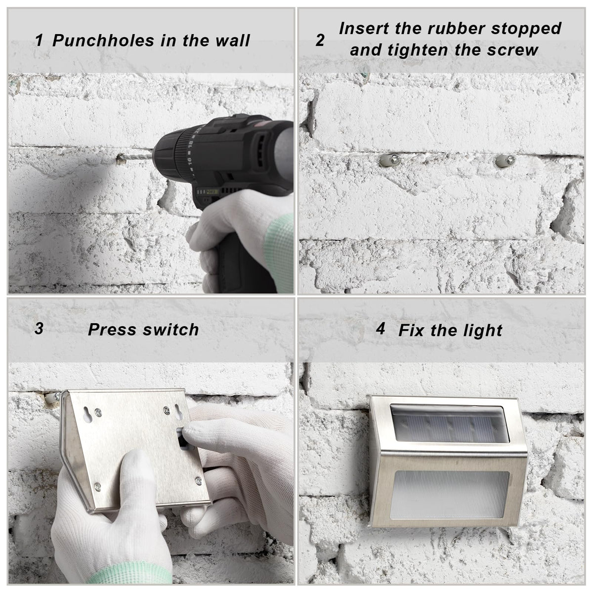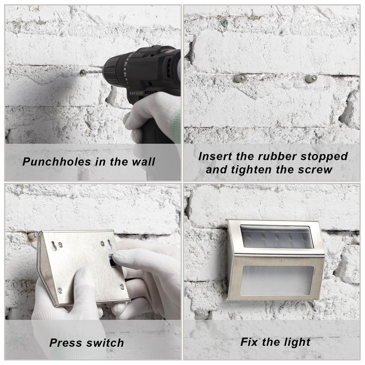 Q: How do I install the solar-powered fence lights?A: Installation is simple and straightforward. You only need to use two screws to fix each light directly to your desired location. No wiring is required, making it easy to set up even for beginners.