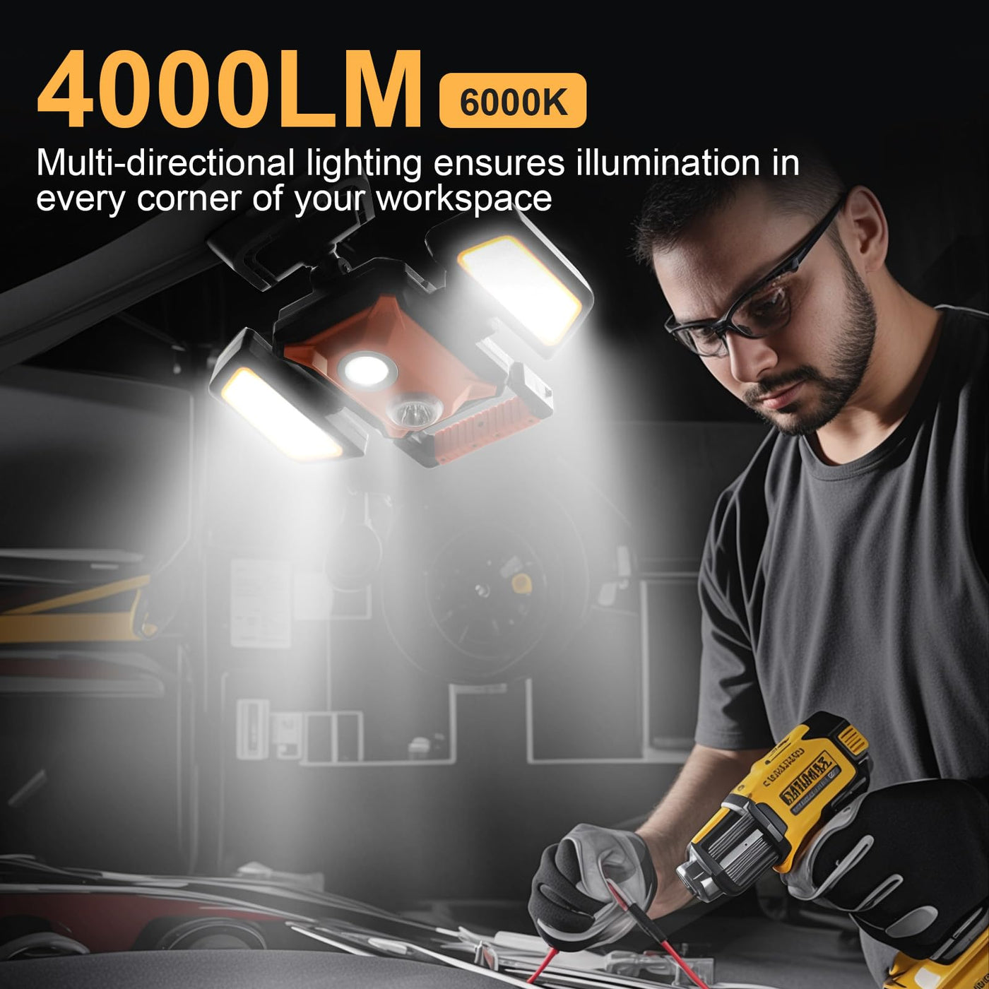 This Ultra-Bright Led Work Light Delivers 4000 Lumens With Multi-Directional Lighting, Ensuring Maximum Visibility For Any Task. It Features 5 Adjustable Brightness Modes And Is Powered By A Long-Lasting 4400Mah Rechargeable Battery, Offering 3-9 Hours Of Use. The Light? 360? Rotation And 180? Folding Side Lights Provide Flexible Lighting Angles. With Strong Magnets, A Clamp For Surfaces Up To 2 Inches Thick, And A Built-In Hook, This Work Light Can Be Mounted Anywhere For Hands-Free Use. Ip65 Waterproof And Backed By A 12-Month Warranty, It? Perfect For Both Indoor And Outdoor Work.