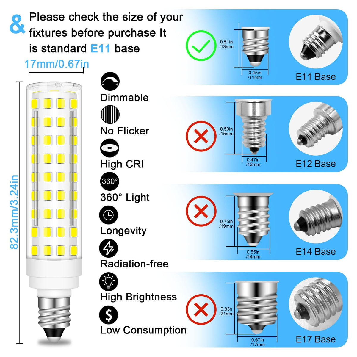 Dimmable Material: Ceramic + PC Base Type: E11 LED Type: 2835 SMD LED Quantity: 96 LED Working Voltage: AC110-130V Power: 10 Watt Color Temperature: 6000K Daylight White Package included: 3 Pack E11 10w led bulb 1. Efficient Illumination. Each E11 mini led bulb emits brightness with about 950lm, improving the brightness of your Home. 2. Equivalent to 100W halogen light bulbs, with only 10W power consumption, saving electricity bills. Money saving and energy saving. 3. Easy installation. Installs into existing candelabra fixture with E11 base directly. 4. Long lifespan. More than 25000 hours lifespan, reducing bulbs replacing frequency. 5. Suitable for interior lighting, signal lights, lamps and fixtures of any suitable style in living room, bedroom and kitchen. Note: 1.Only for Indoor use .Turn off power before installation. Do not touch bulb when operating or when hot. 2.Please measure the size before purchase, as shown in the picture Make sure that the bulb size is suitable for your lights. 3.Please do not directly look at the bulb in close distance. It's bad for your eyes.