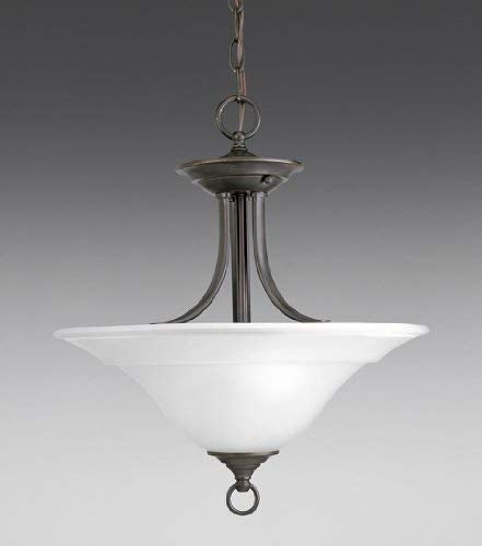 Product DescriptionTwo-light semi-flush close-to-ceiling fixture featuring soft angles, curving lines and etched glass shades. Gracefully exotic, the Trinity Collection offers classic sophistication for transitional interiors. Sculptural forms of metal and glass are enhanced by a classic finish. This transitional style can transform a room or your whole home with its charming versatility. Antique Bronze finish.From the ManufacturerGracefully exotic, the Trinity Collection offers classic sophistication for transitional interiors. Sweeping, minimalist forms are enhanced by a warm antiqued metal finish. Two-light semi-flush close-to-ceiling fixture. Uses (2) 100-Watt medium base bulbs 16-Inch Diameter x 15-Inch Height Installs as either close-to-ceiling or hanging fixture with included hardware