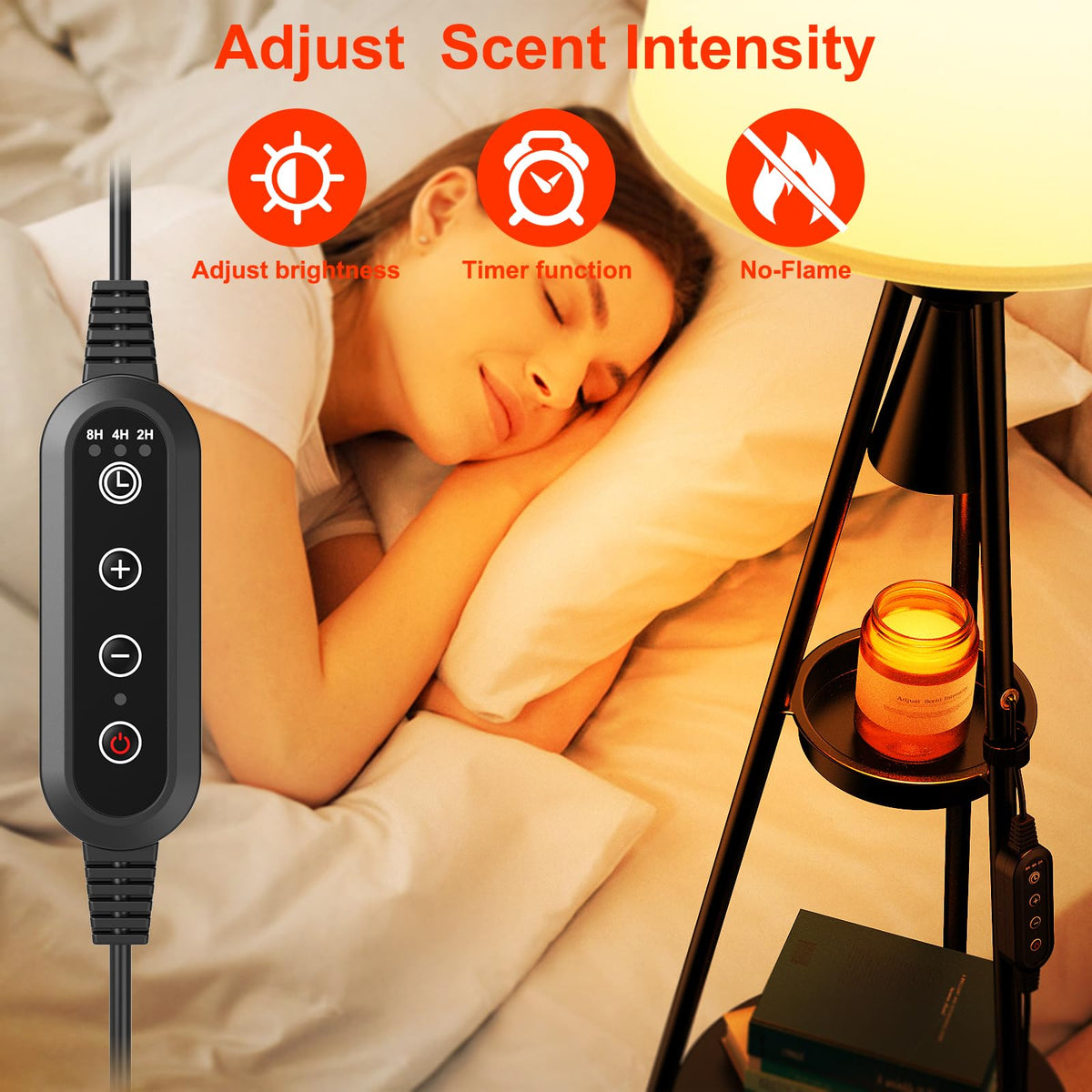 Q: How does the candle warmer feature work?A: The candle warmer lamp uses a flameless design to safely melt candle wax, eliminating smoke and soot. It includes a dimmer control to adjust the melting speed and a timer feature with 2, 4, or 8-hour options for automatic shut-off, ensuring a cleaner and more efficient experience.