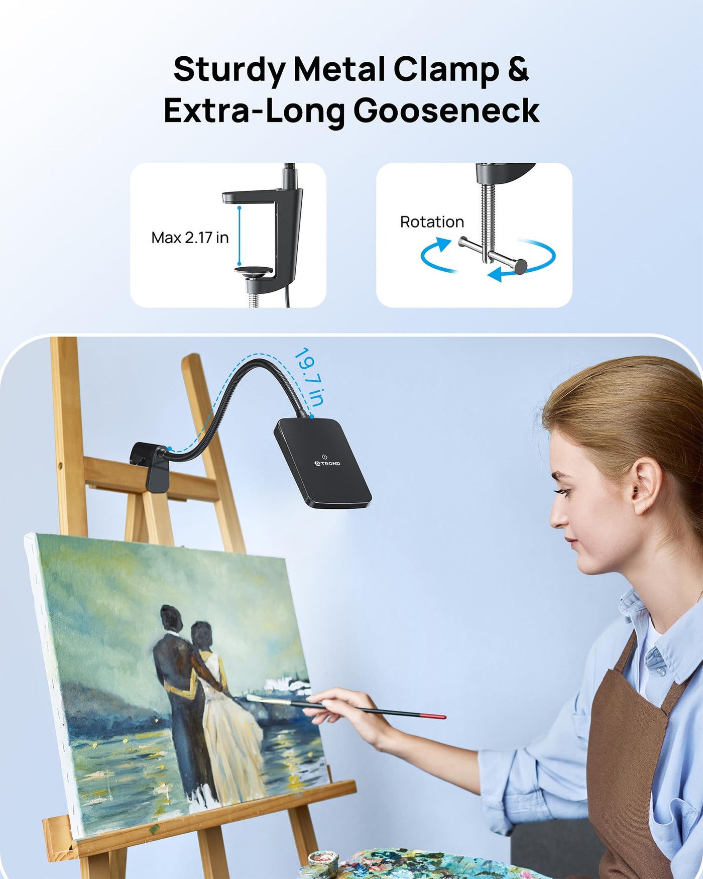 Infinite Flexibility Strong Aluminum Clamp Opens Up To 2.17 Width And Can Be Used Perfectly With Music Stands, Pianos, Office Tables, Computer Desks And Headboards. Durable Gooseneck Design With The Length Of 50Cm/19.7 , Allows You To Adjust Your Lamp With Ease And To Direct The Light Wherever You Want. Premium Diffusion Film Adopted Thereve Been A Small Portion Of Customers Who Complain About The Inadequate Light That Our Previous Models Emit. We Listen To Our Customers And Have Always Been Looking For Ways To Increase The Brightness. With Premium Diffusion Film Invented By Skc Haas From South Korea, Weve Increased The Lamp Brightness By 50%. Flicker-Free, Anti-Glare & Eye Protection Unlike Conventional Point Light Source, Trond Halo 9W-C Adopts Surface Lighting Source And Innovative Light Guide Panel Technology, Which Can Create A Soft, Flicker-Free And Greatly Reduces The Formation Of Shadows. Say Farewell To Eye Fatigue, And Give Your Eyes A Break Through Long Work Sessions Effortlessly. Specifications: - Material: Premium Abs Plastic & Aluminum Alloy - Power Consumption: 9W (Max) - Cri Ra: Over 82 - Total Flux: 1000 Lumen - Color Temperature: 5800K ~ 6000K (Daylight) - Illumination: >600Lux@30Cm (Dim), >1200Lux@30Cm (Bright), >1800Lux@30Cm (Brightest) - Lamp Head Size: 3.35 X 5.31 - Gooseneck Length: 19.7 (Fully-Extended) - Clamp Width: 2.17 (Max.) - Operating Temperature: -10? ~ 50? - Weight: 0.9 Lb. / 410 G (W/O The Power Adapter) Important: - This Lamp Doesnt Have The Built-In Battery And Can Only Be Powered On By The Included Power Adapter. - For The Latest Inventory, Please Press 2 Seconds To Turn Off The Lamp At Any Time. The Upgraded Memory Function Allows The Lamp To Remember The Brightness Setting From Your Last Use.