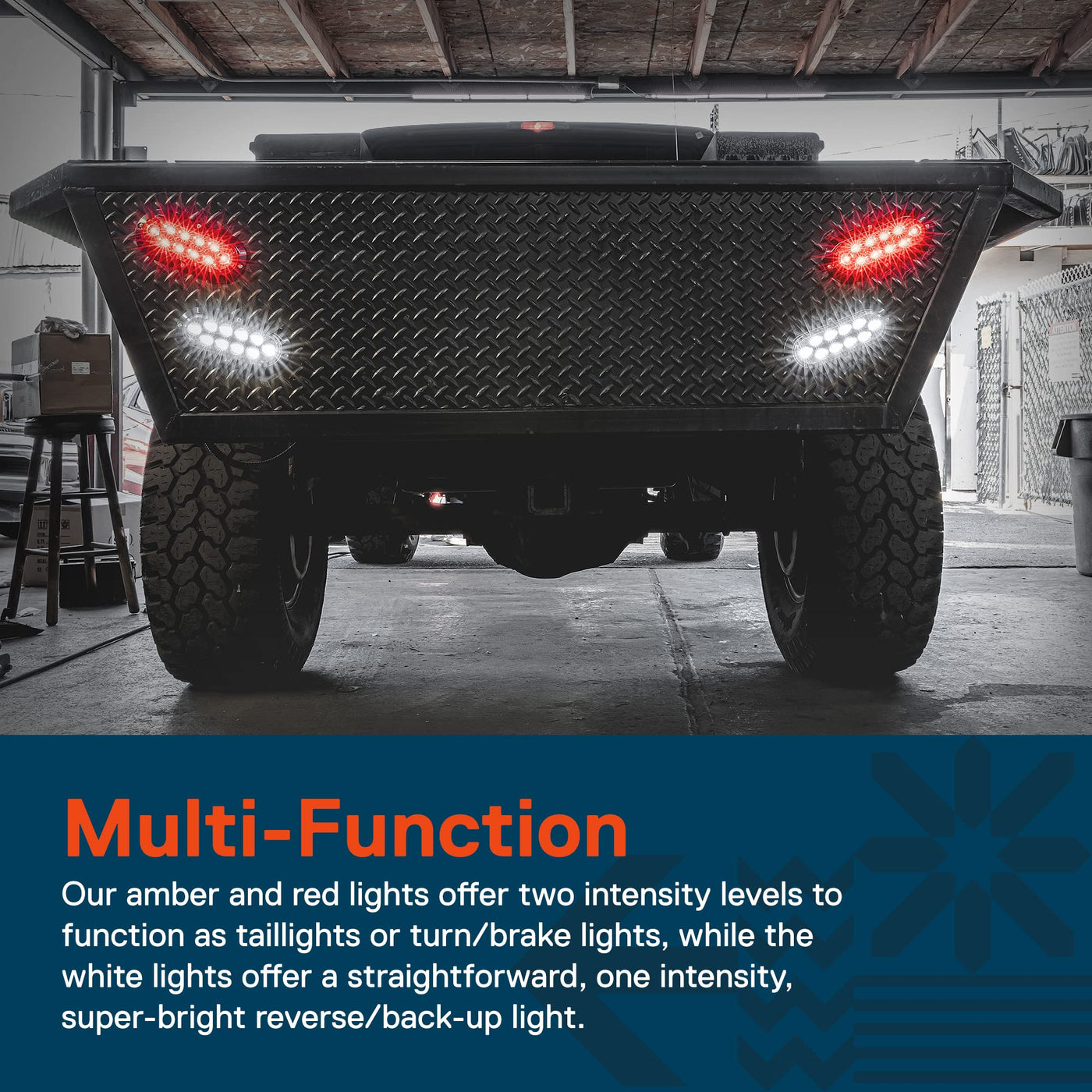 Simplified InstallIdeal for upgrades and new builds, our new surface-mount, LED trailer lights are designed to save you time and busted knuckles. Unlike traditional, bezel-mounted tail lights, these lights don’t require a large mounting hole. Simply drill one small hole for the wires and then let the included self-tapping screws do the rest of the work. Keeping You LegalFinding a clearance light that meets your needs goes beyond just ease of use and longevity, the light must also meet DOT regulations. Our red trailer lights meet all of the requirements for brake lights, taillights and turn signals; our amber lights meet the requirements for turn signals and parking lights; and the white lights meet the requirements for reverse lights. Better, Brighter, StrongerDon’t just catch problems early, avoid them completely. With a new set of long-lasting, maintenance-free LED taillights lights, you can eliminate failures, reduce repair times, and maximize your time spent on the road. In addition, with ten LEDs per light, these units are brighter than traditional clearance lights and greatly improve safety, reduce accidents, and keep you on the road.FeaturesSAE and DOT FMVSS-108 CompliantSurface-Mounted for Easier Install10 Colored LEDs with Colored LensIP67 Submersible Waterproof RatingParking/Turn/Brake for Amber and RedBright Reverse for White
